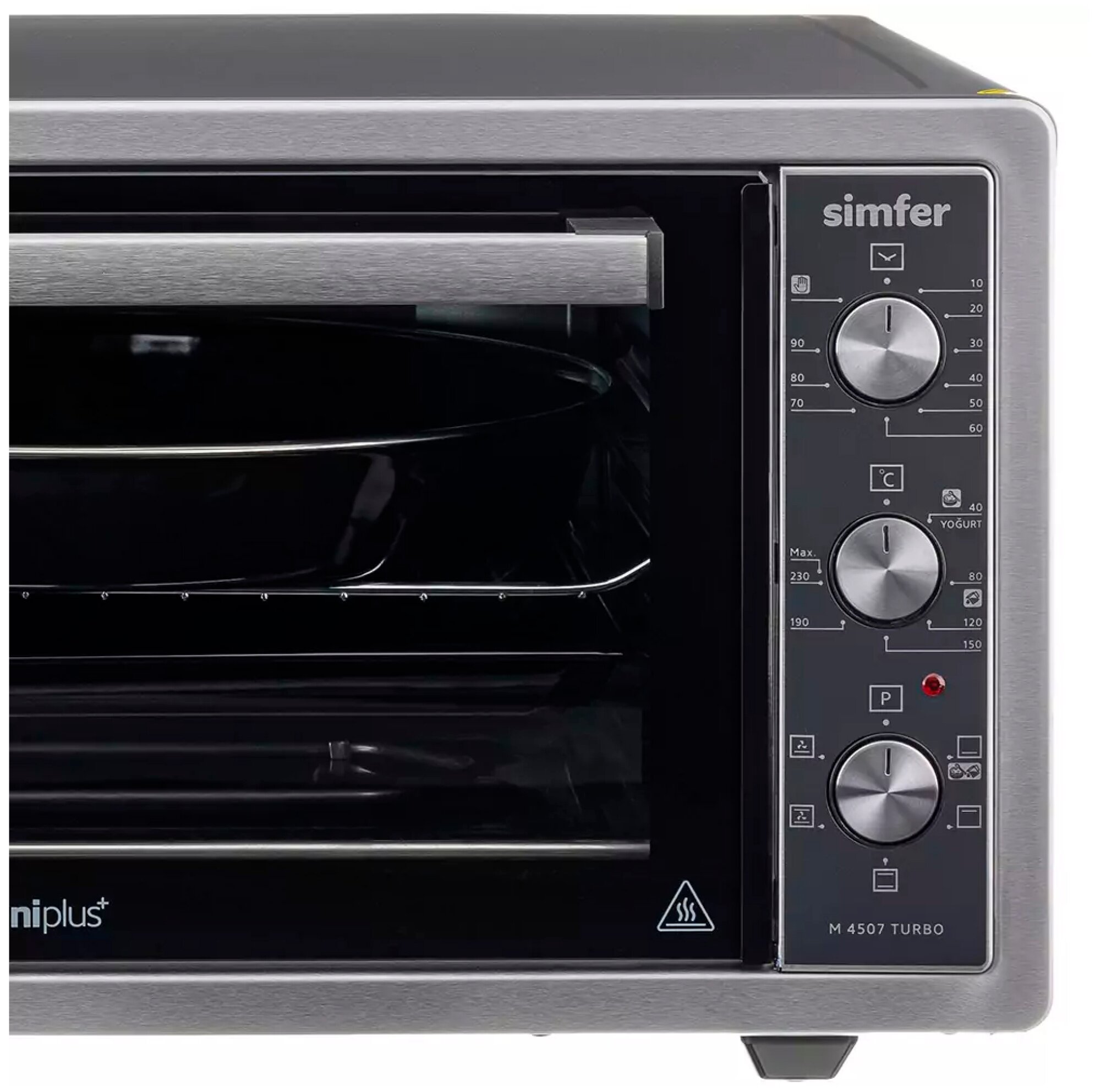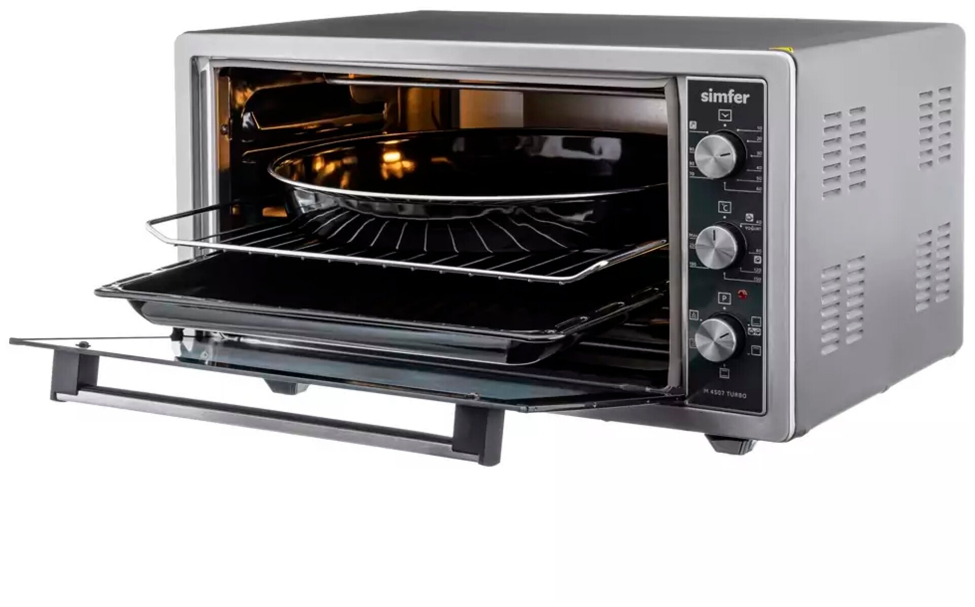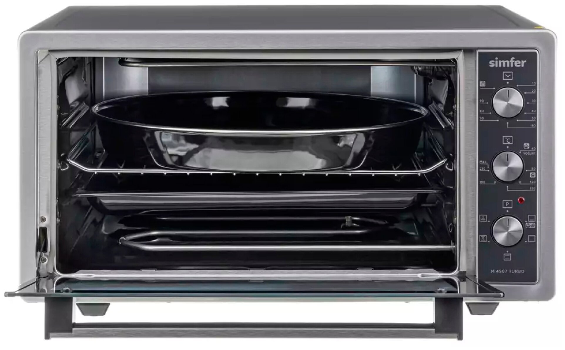 7 режимов работы: верхний нагрев, верхний+нижний нагрев, нижний нагрев, верхний + нижний нагрев + конвекция, нижний нагрев+конвекция, очистка духовки, режим йогурт; в комплекте стандартный противень, круглый глубокий противень, хромированная решетка, инструкция, гарантийный талон; звуковой сигнал отключения, подсветка; при первом запуске рекомендуется протопить печь 45 минут при температуре 200 °C для прогорания заводской смазки; количество противней в комплекте: 2