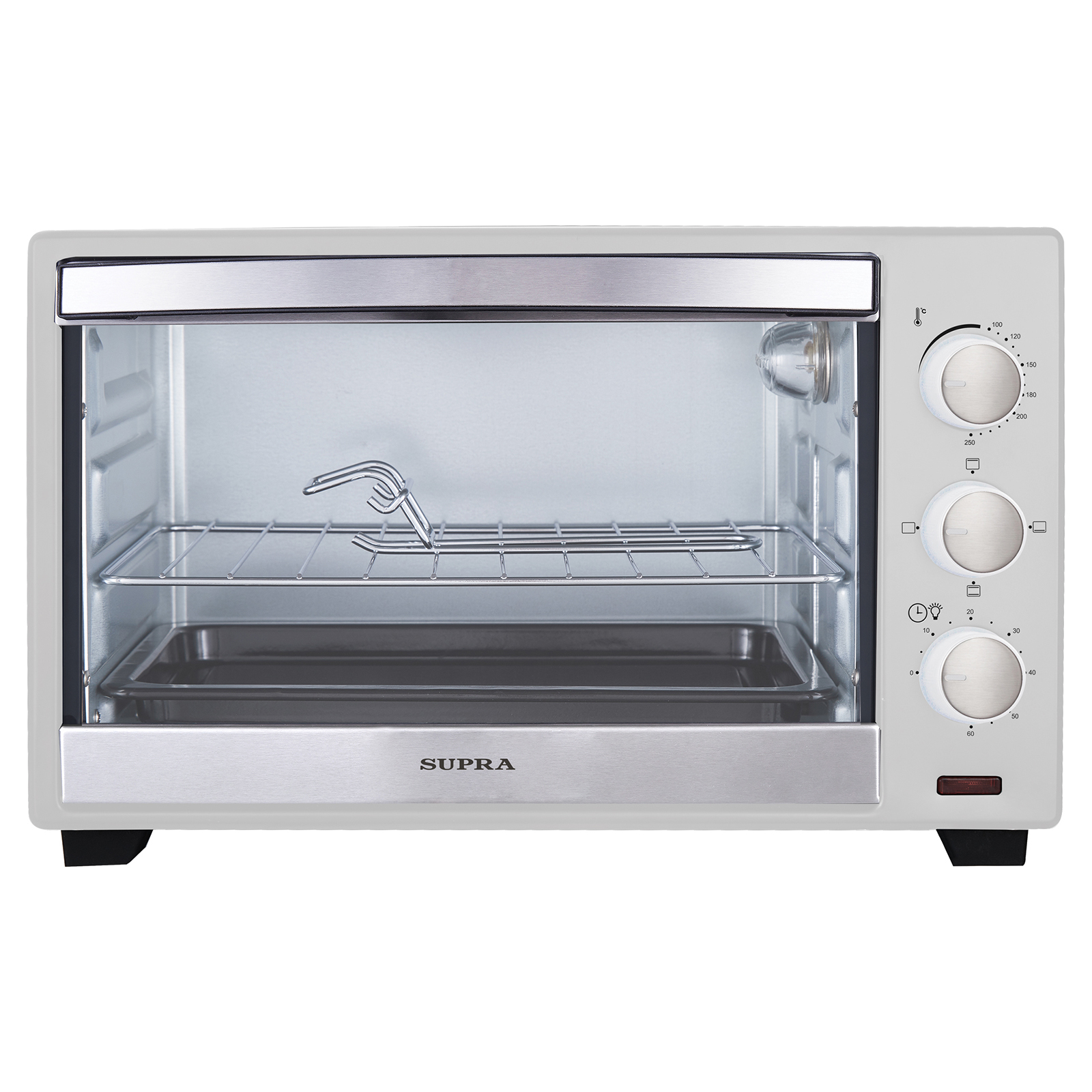 электропечь, металлическая решетка, плоский противень, круглая форма для пиццы, ухват для противня, гарантийный талон, инструкция на русском языке