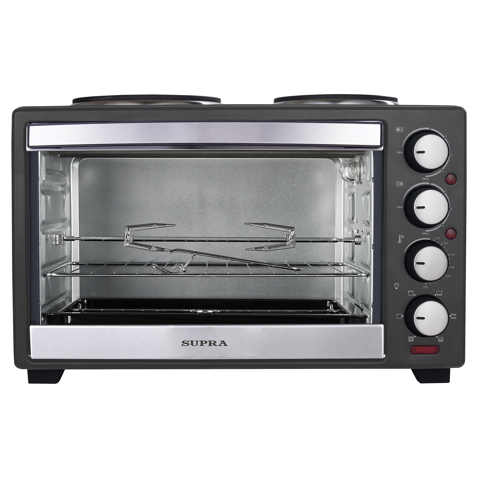 электропечь, металлическая решетка, плоский противень, насадка для шашлыка/кебаба, ухват для противня, вертел, ухват для вертела, инструкция на русском языке