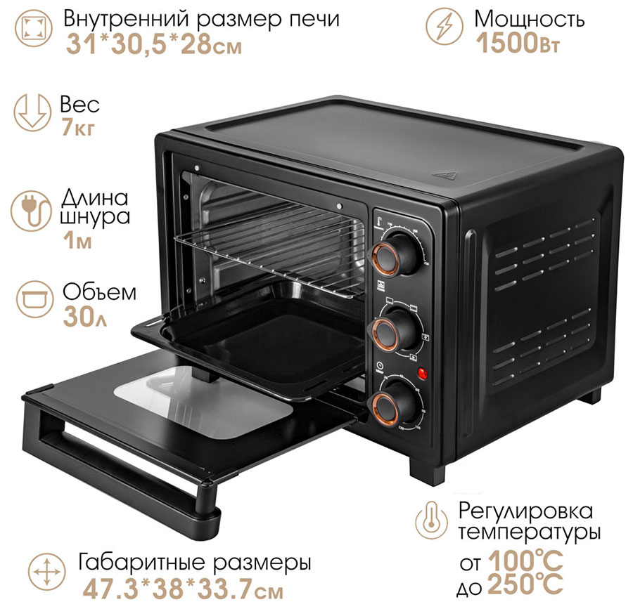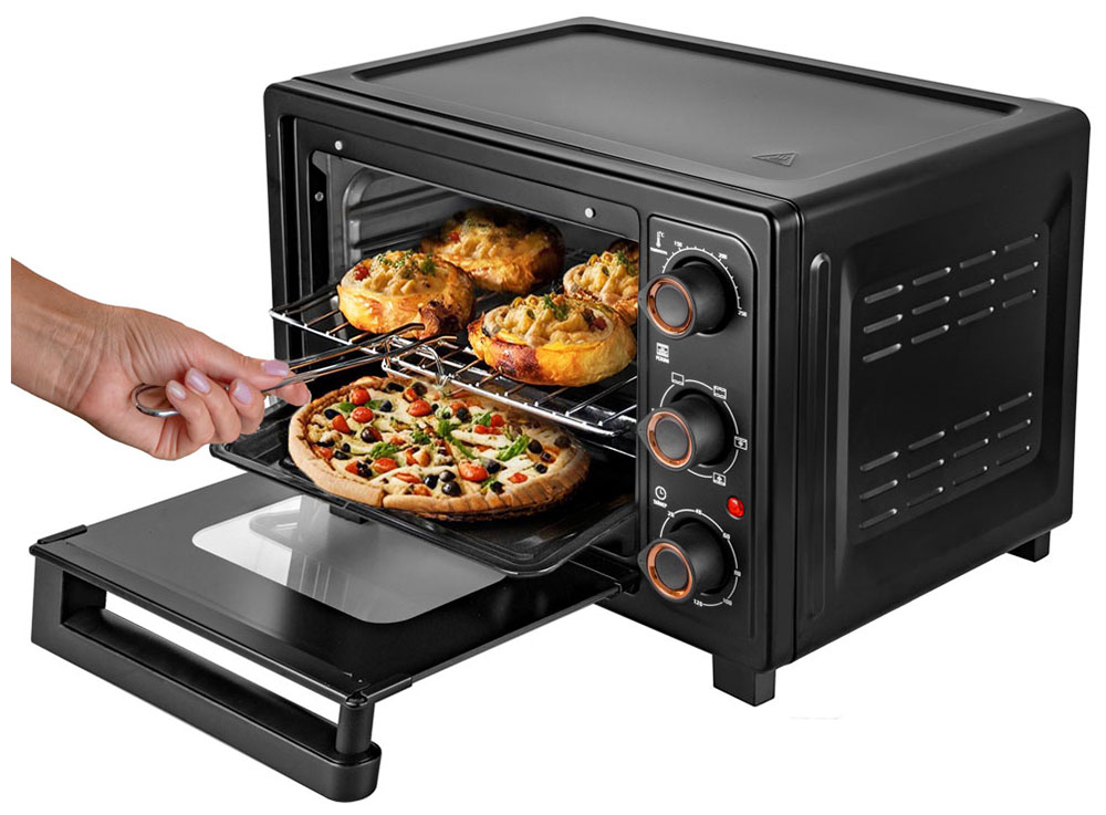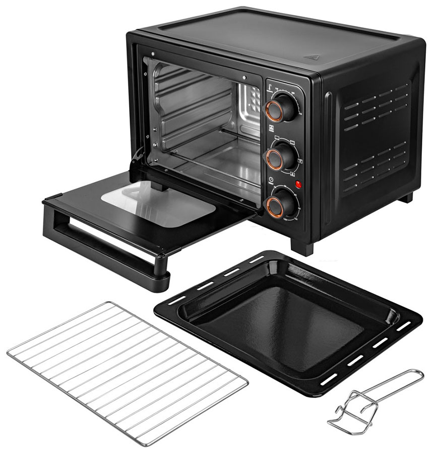 Мини-печь, противень, хромированная решетка, ухват для противня, руководство пользователя, гарантийный талон