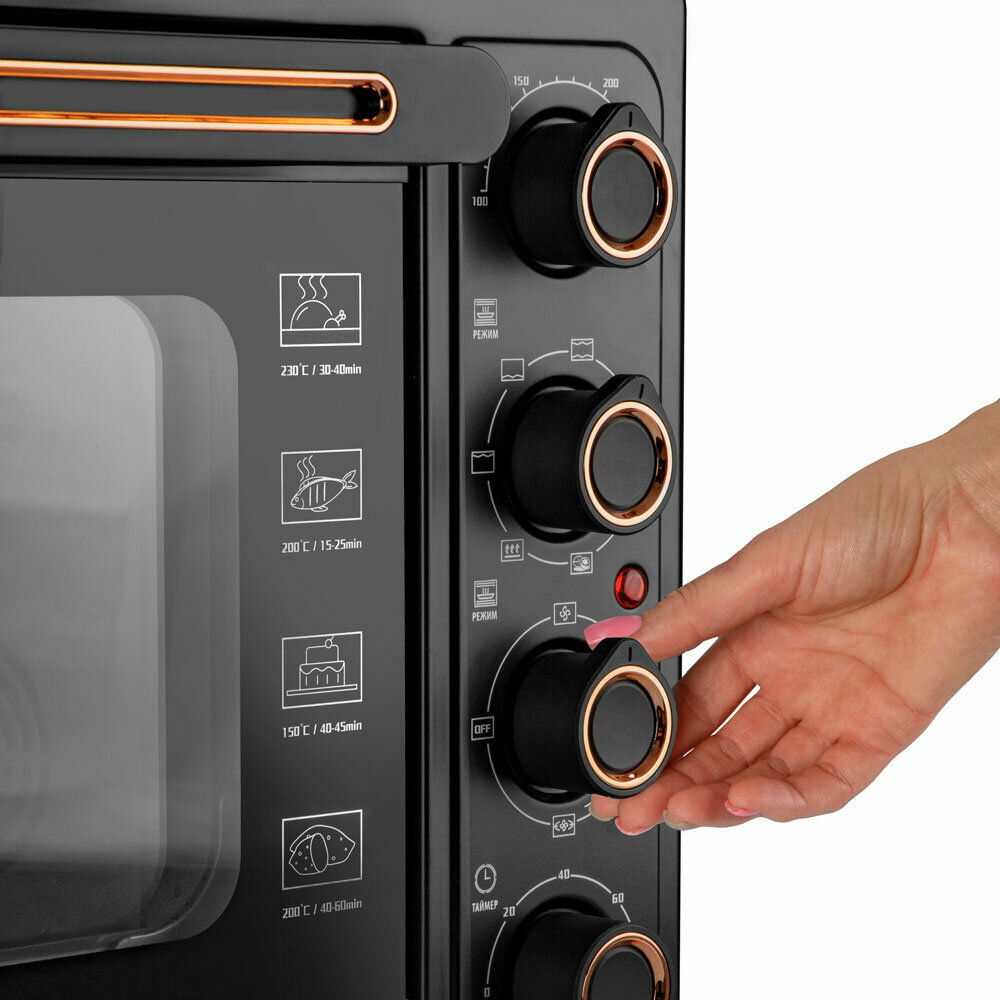верхний гриль, верхний нагрев, верхний+нижний нагрев, конвекция, нижний нагрев, поддержание температуры, размораживание, Вертел, Гриль