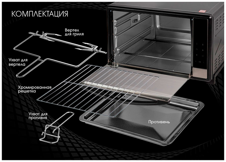 Печь, Противень, Решетка, Ухват для противеня, Вертел, Держатель вертела, Руководство пользователя, Гарантийный талон