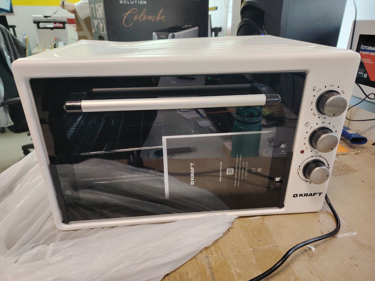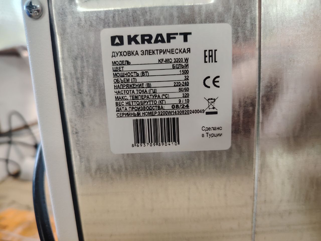 Электрическая духовка Kraft KF-MO3200W в белом цвете. Объем духовки 32 литра. Мощность 1500 Вт обеспечивает быстрый нагрев. В комплект входит глубокий прямоугольный противень и решетка.