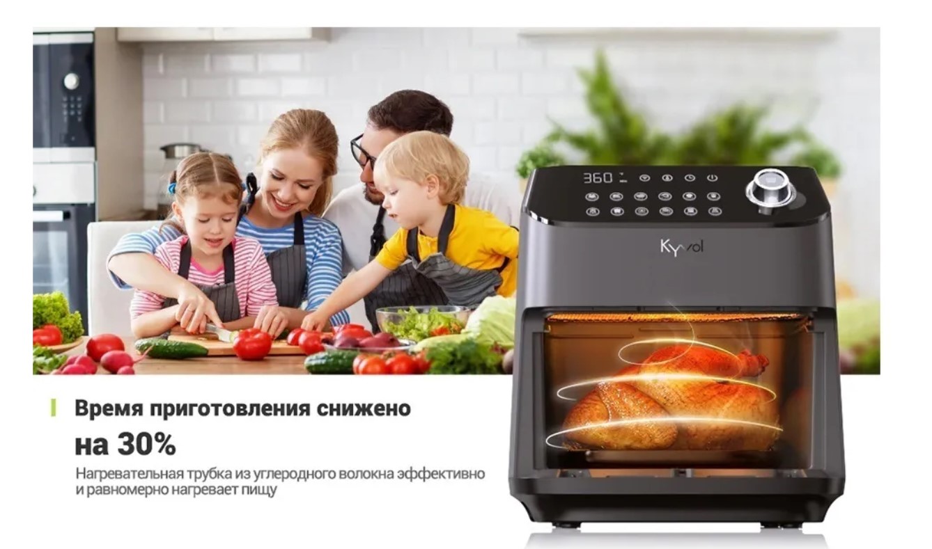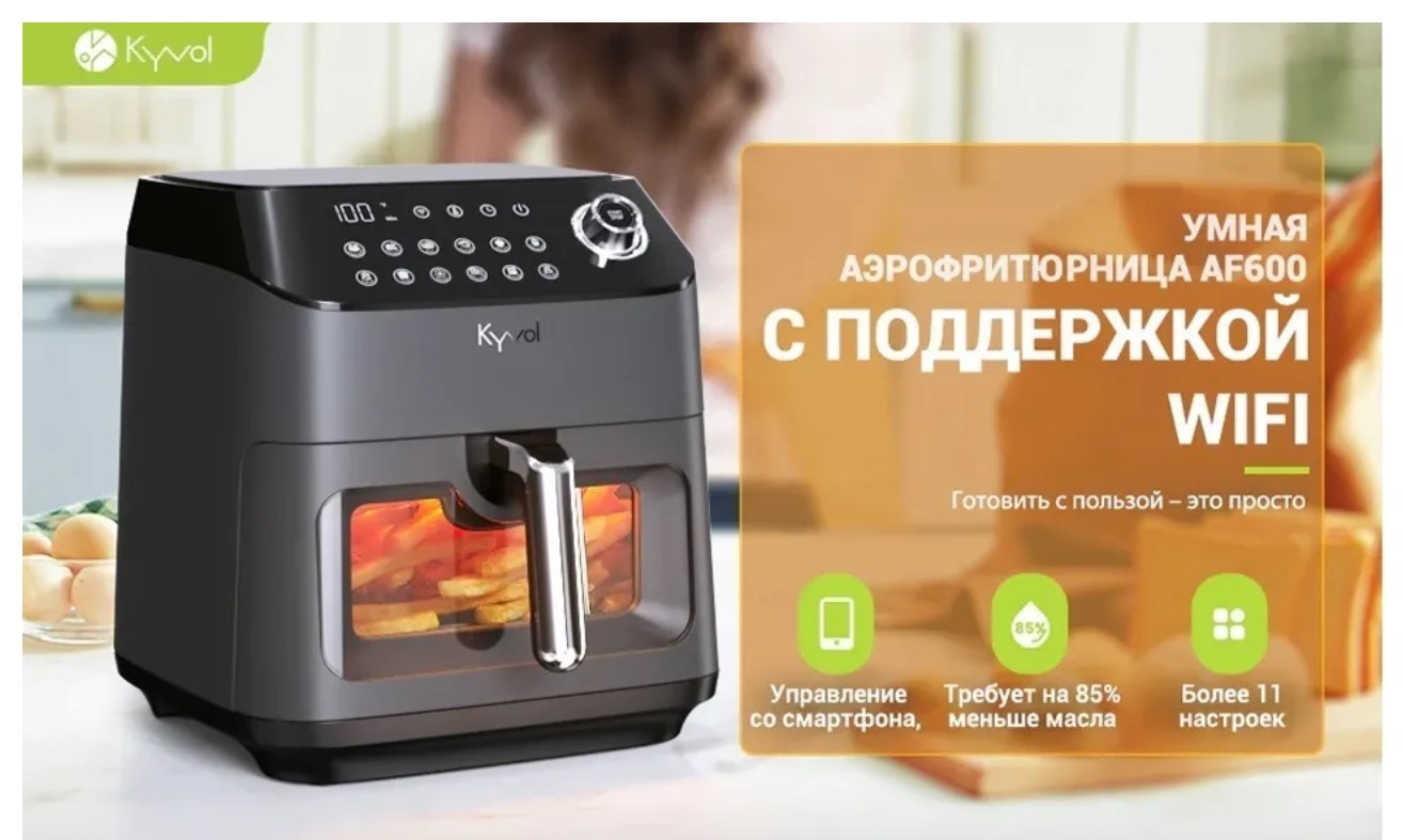 Kyvol AF600W - высокотехнологичная фритюрница которая заботится о вашем здоровье. С помощью высокоскоростной циркуляции раскаленного воздуха AF600W готовит без добавления масла. Это позволяет продуктам сохранить свои полезные свойства, сократить количество жира на 85%. А также значительно уменьшить содержание нитратов в пище. В данной модели вы без труда приготовите куриные крылышки, картошку фри, шашлык, креветки и многое другого.