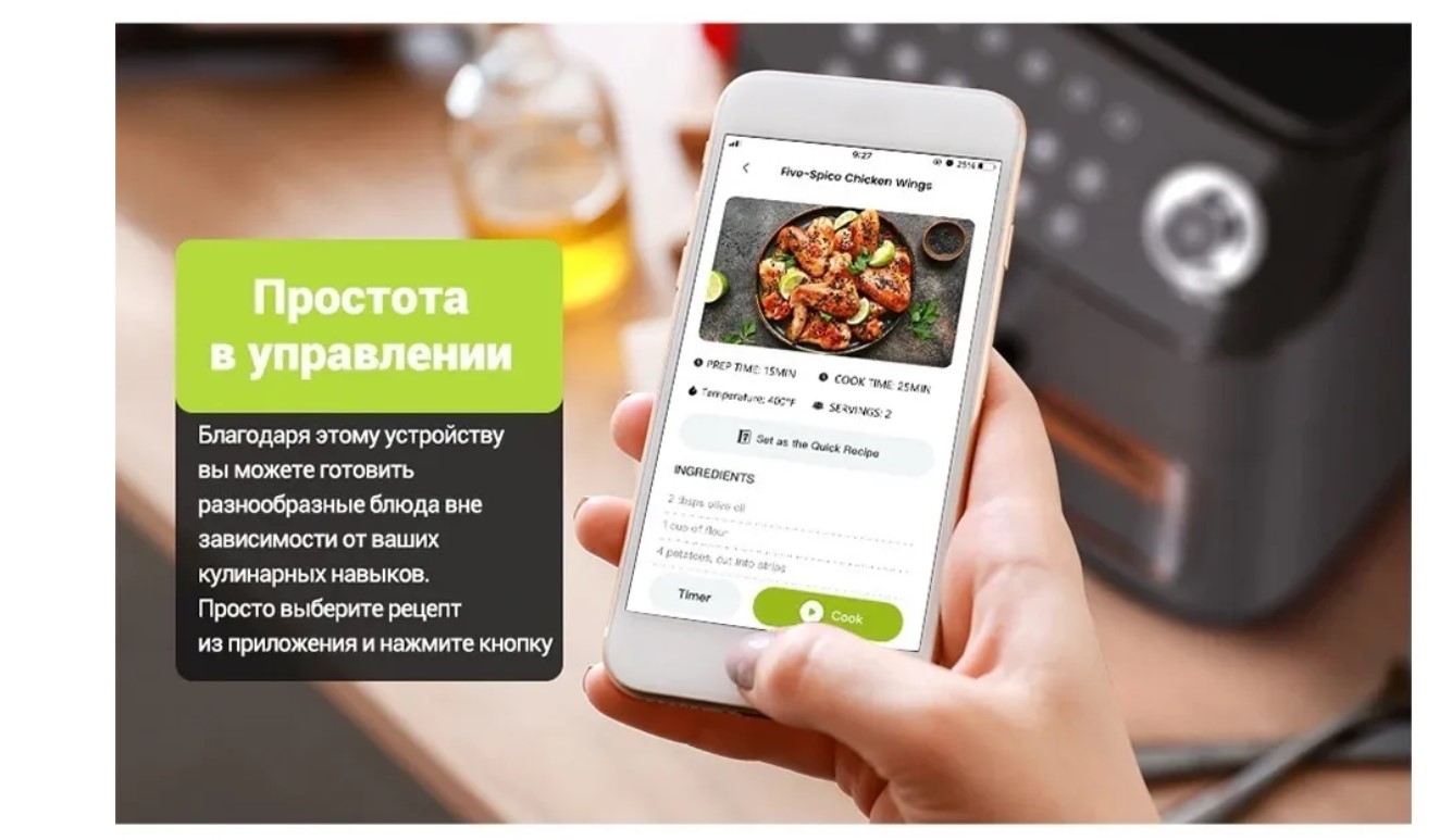 С помощью беспроводного подключения по Wi-Fi вы сможете управлять работой прибора посредством смартфона или планшета. Регулировать температуру и время приготовления, выбирать предварительную настройку и даже откладывать начало приготовления на срок до 6 часов. А так же просматривать историю приготовлений и с легкостью повторять свои прошлые кулинарные шедевры. Благодаря Kyvol AF600W вы сможете готовить разнообразные блюда вне зависимости от ваших кулинарных навыков. Просто выберите рецепт из приложения и нажмите кнопку. Список рецептов обновляется ежемесячно.