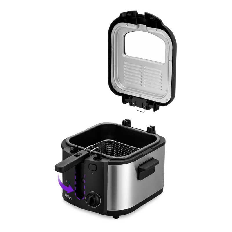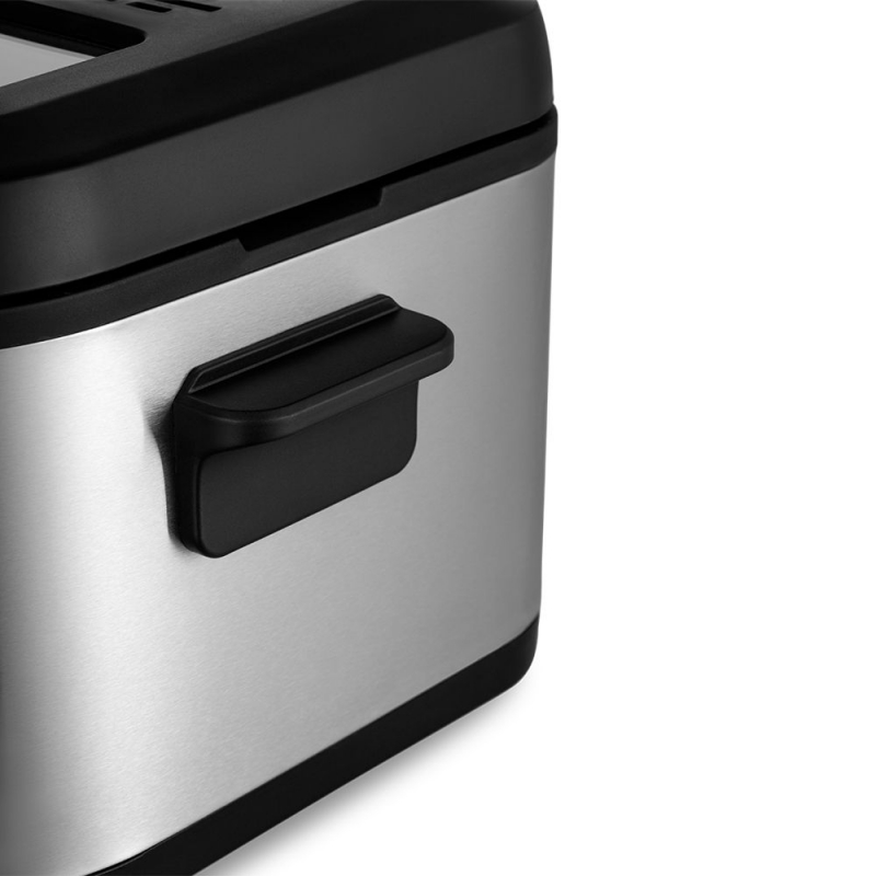 Крышка фритюрницы плавно открывается при нажатии кнопки на корпусе прибора. Такая конструкция делает работу с прибором более комфортной и безопасной — вы не обожжете руки сильным потоком пара, который выходит из фритюрницы, как только крышка открылась.