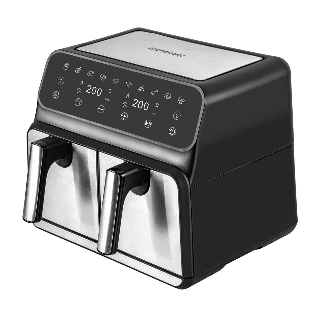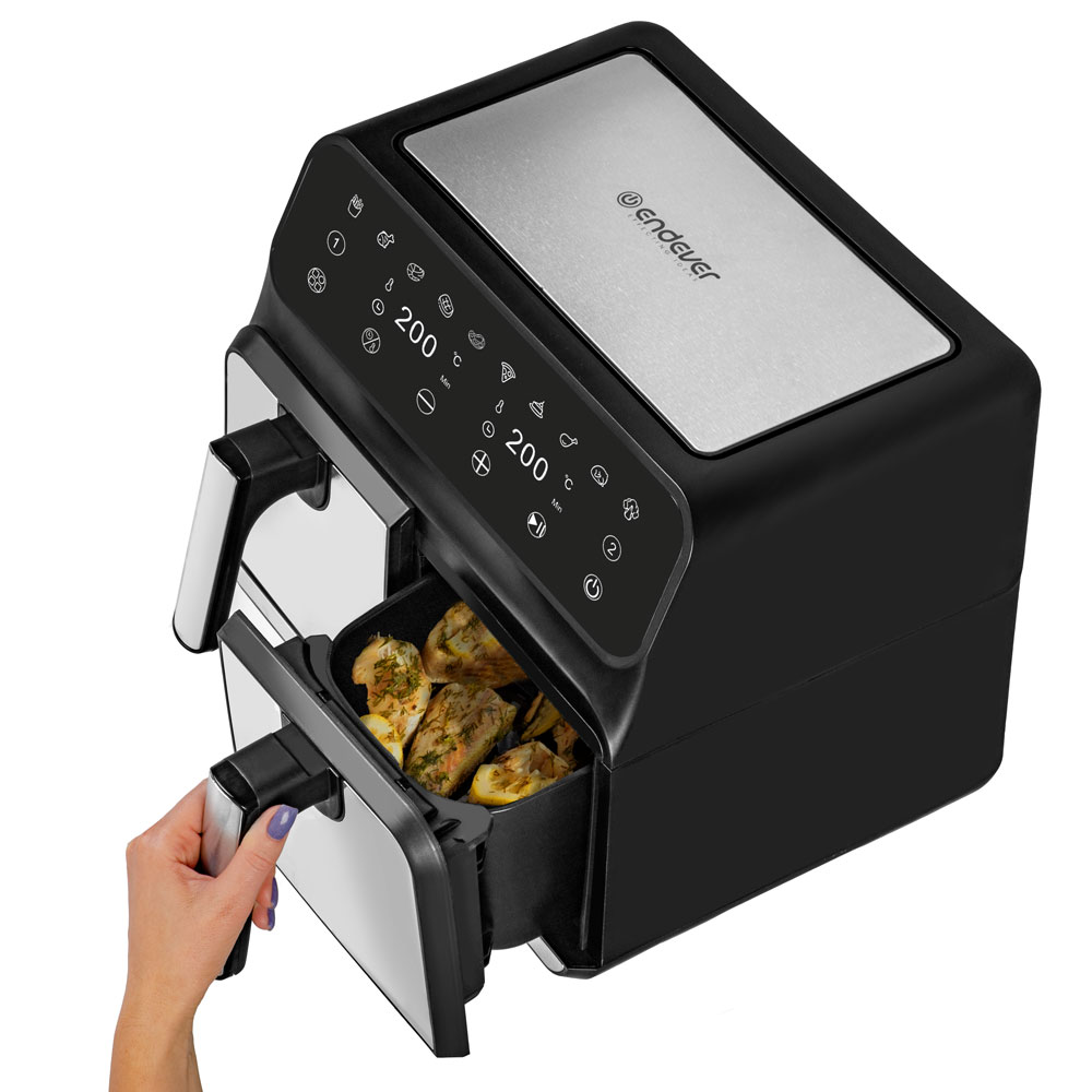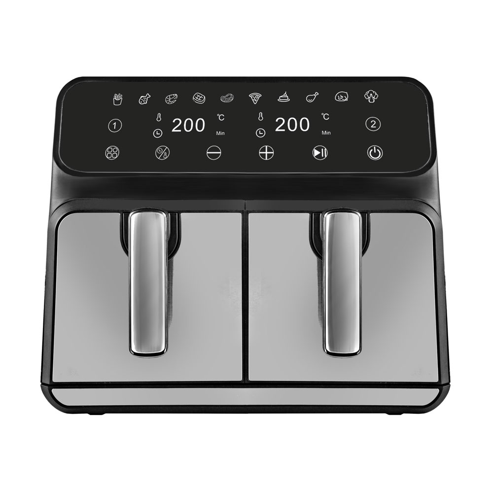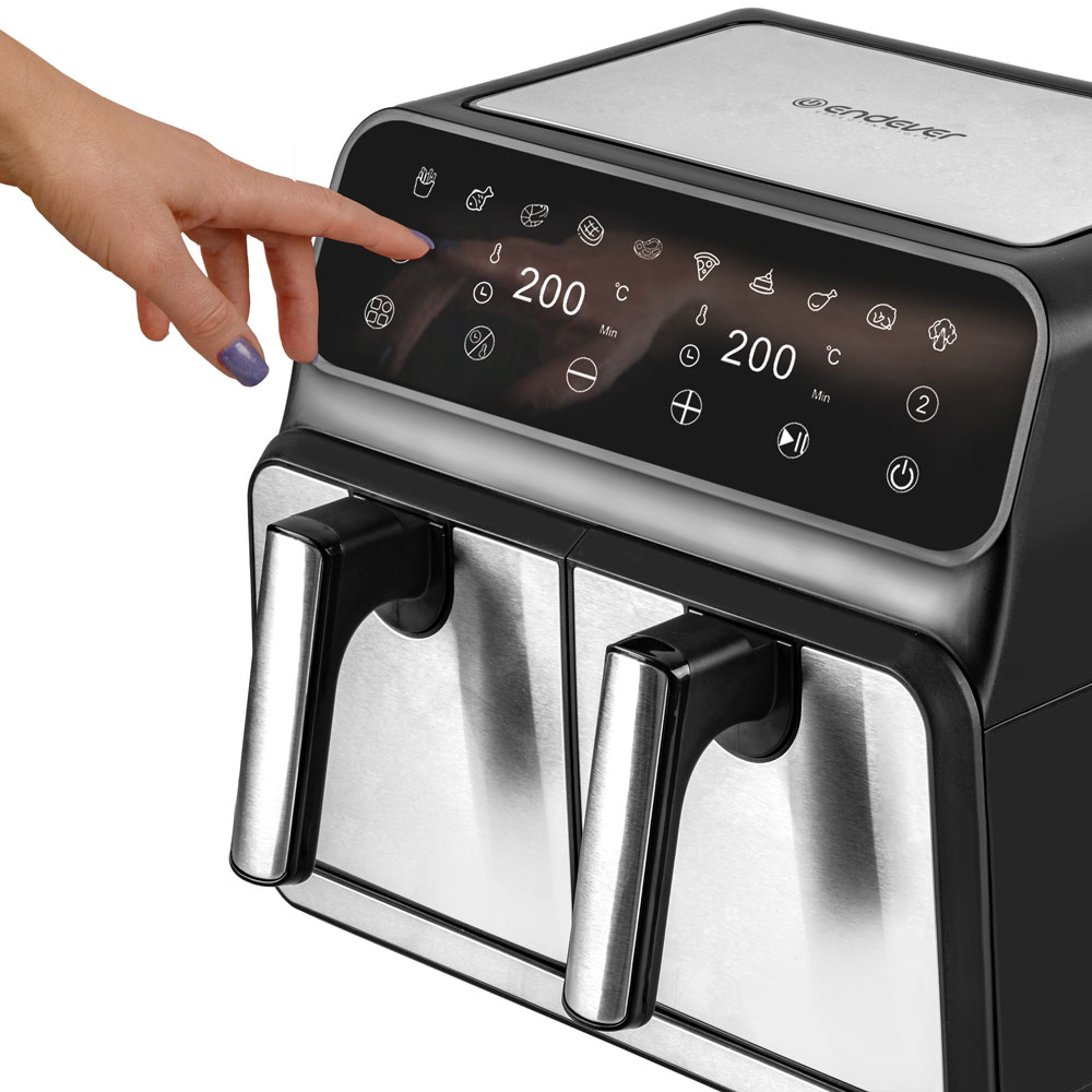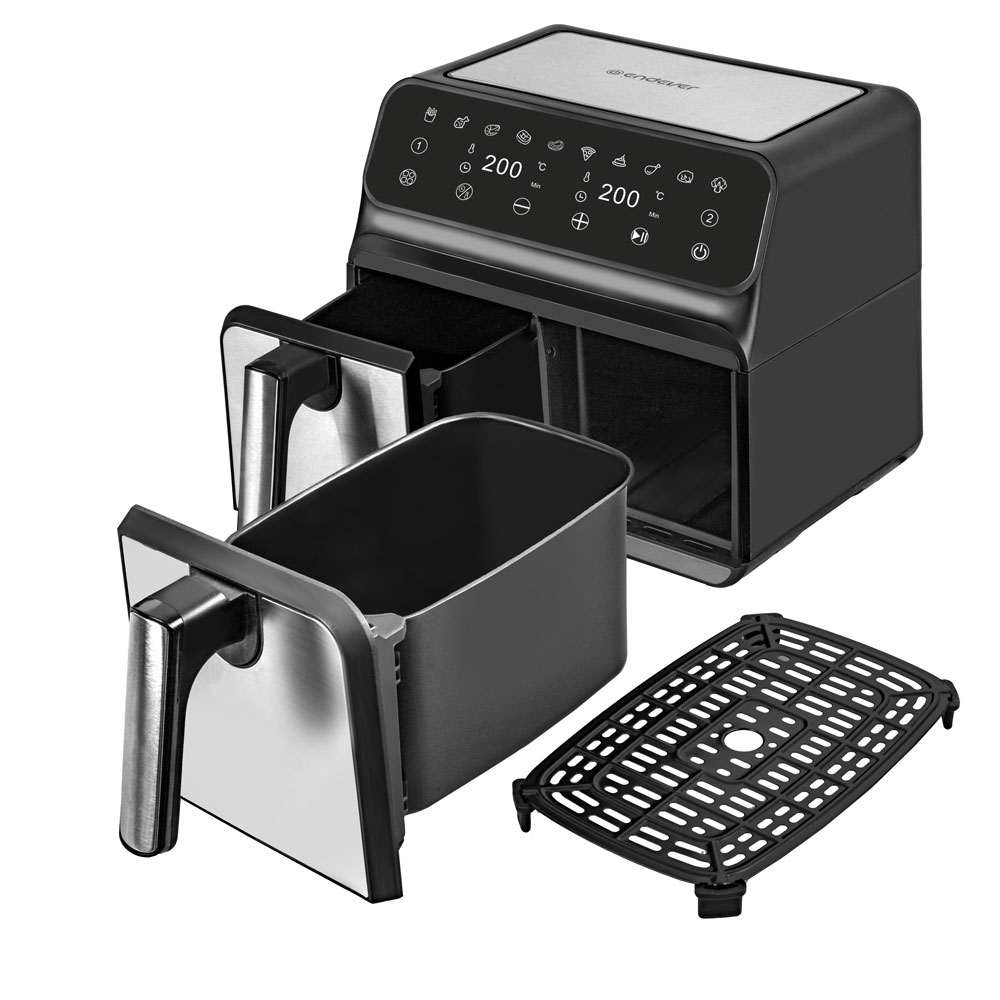 2 контейнера с антипригарным покрытием, 10 автоматических программ, LED дисплей, Таймер на 60 минут, Сенсорная панель управления, Регулировка времени и температуры приготовления для каждого контейнера, Возможность приготовления 2-х разных блюд одновременно, Обжаривание продуктов циркулирующим горячим воздухом без использования масла, Равномерная конвекция для лучшей прожарки, Автоматическое отключение, Защита от перегрева