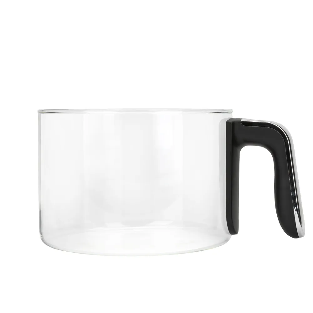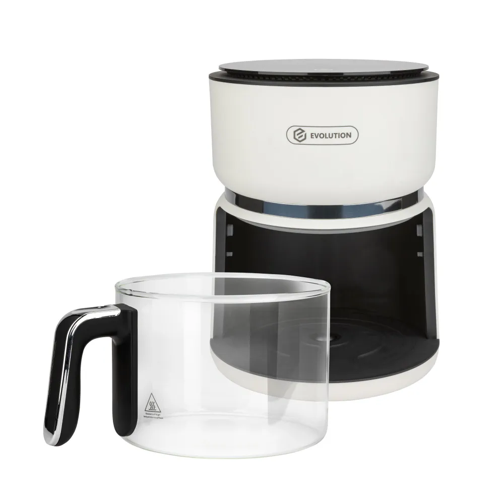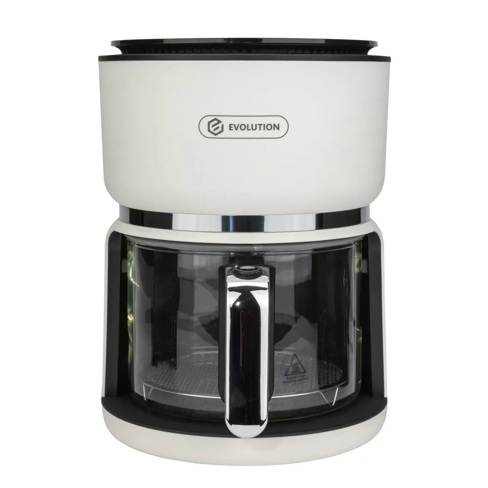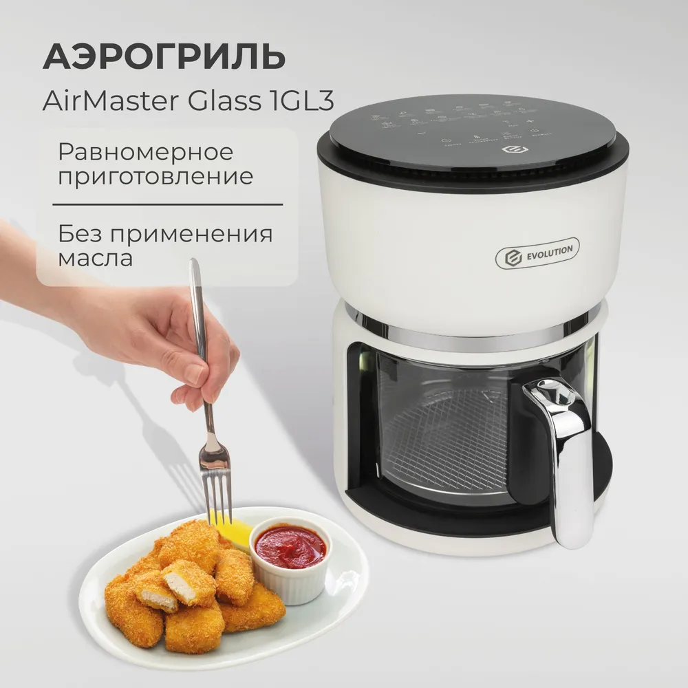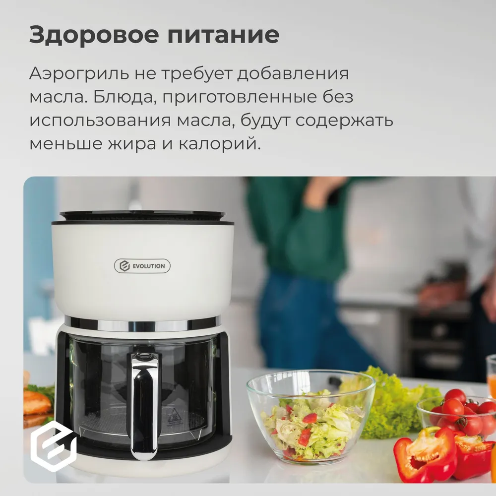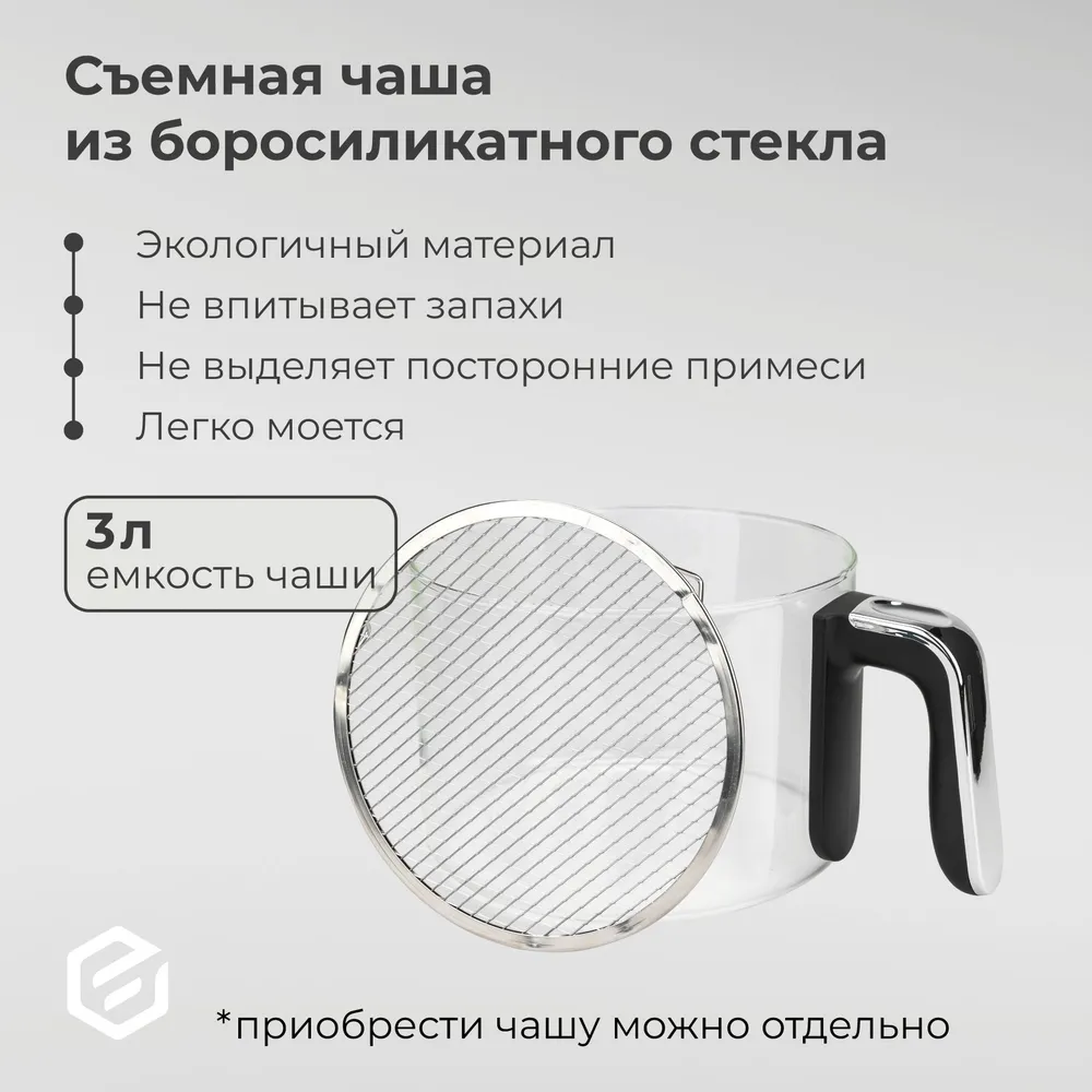 По окончании приготовления аэрогриль автоматически отключается. Съемный поддон и корзина легко вынимаются и моются. Корзина изготовлена из наиболее экологичного для приготовления пищи материала — из боросиликатного стекла, которое выдерживает высокие температуры, легко моется, не впитывает в себя запахи.