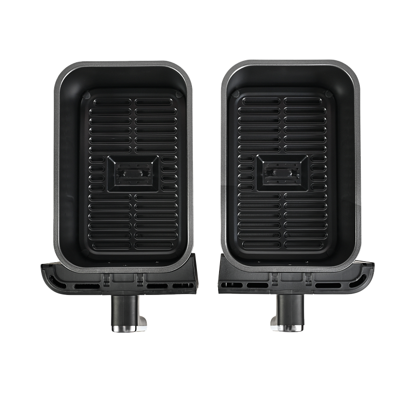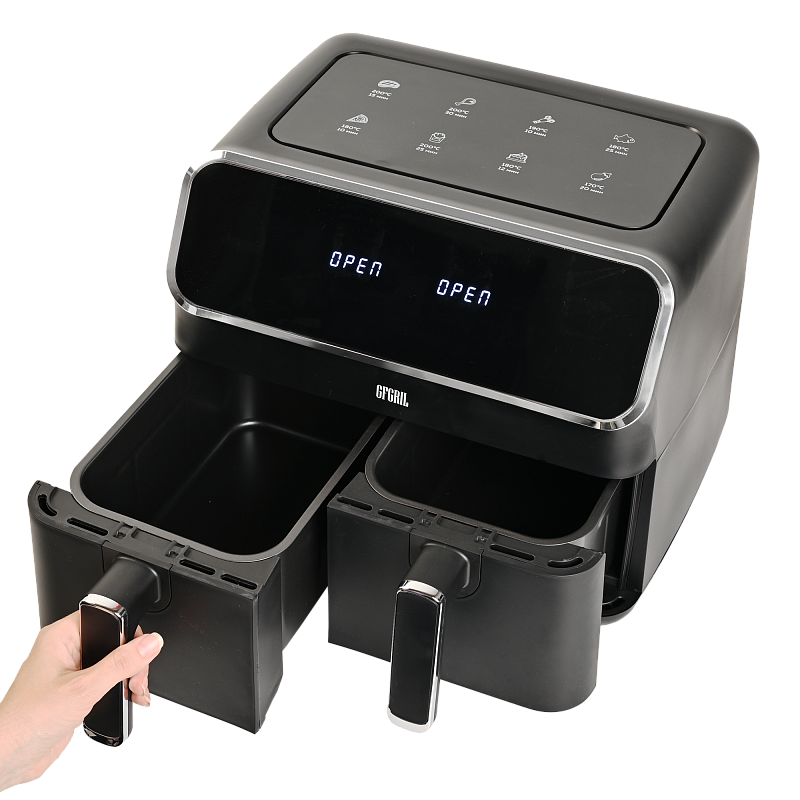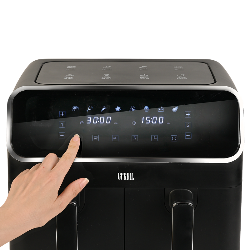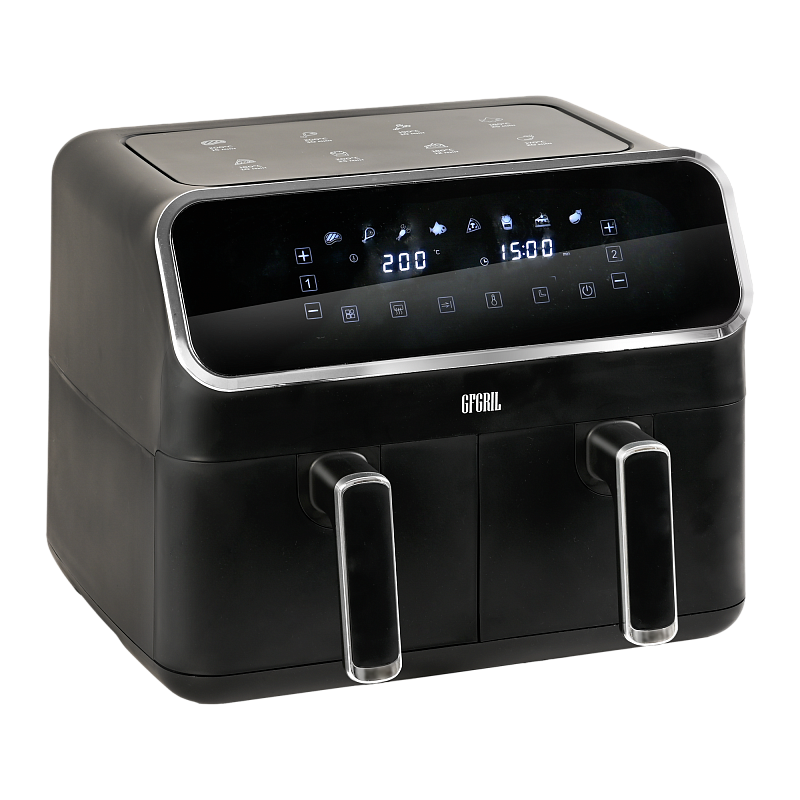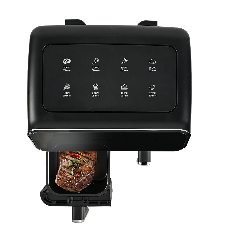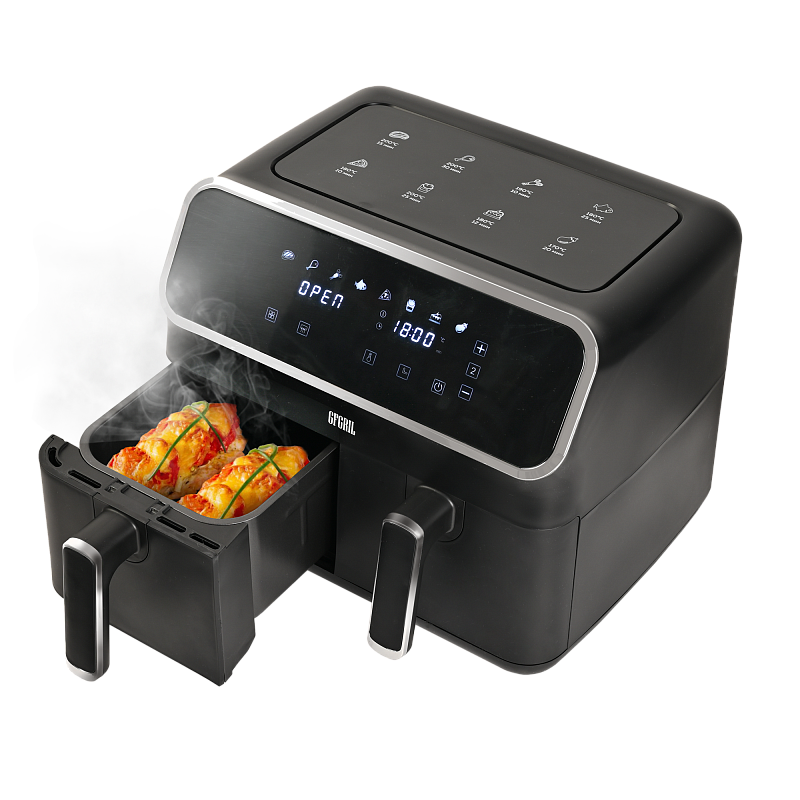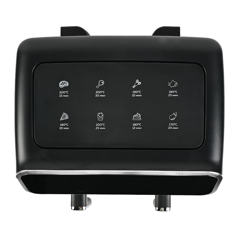 Аэрофритюрница имеет сенсорную панель, которая позволит Вам одним касанием выбрать одну из 8 автоматических программ. Программы устанавливаются отдельно для каждой чаши. Встроенный звуковой сигнал оповестит о готовности блюда. Также можно самостоятельно установить время от 1 до 60 минут и температуру приготовления от 80 до 200 °C для каждой чаши, при этом на дисплеях будет отображаться установленная температура и время, оставшееся до окончания приготовления. Электрический гриль аэро оснащен нагревательным элементом высокой мощности 2700 Вт и встроенным мощным вентилятором, которые обеспечивают быстрый нагрев аэрогриля от 80 до 200 °C, что позволит блюдам быстро и равномерно приготовиться со всех сторон.