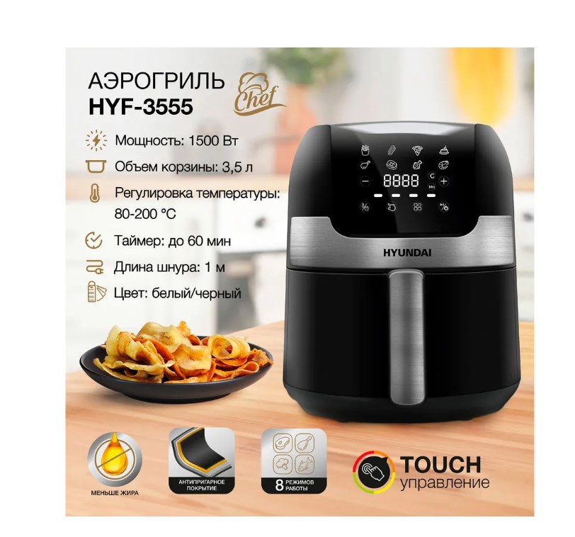 - БрэндHYUNDAIМодельHYF-3555Мощность1500 ВтОбъем чаши3.5 лТемпература80 - 200°СТип нагревательного элементаТЭНТип управленияэлектронноеКоличество программ/режимов9