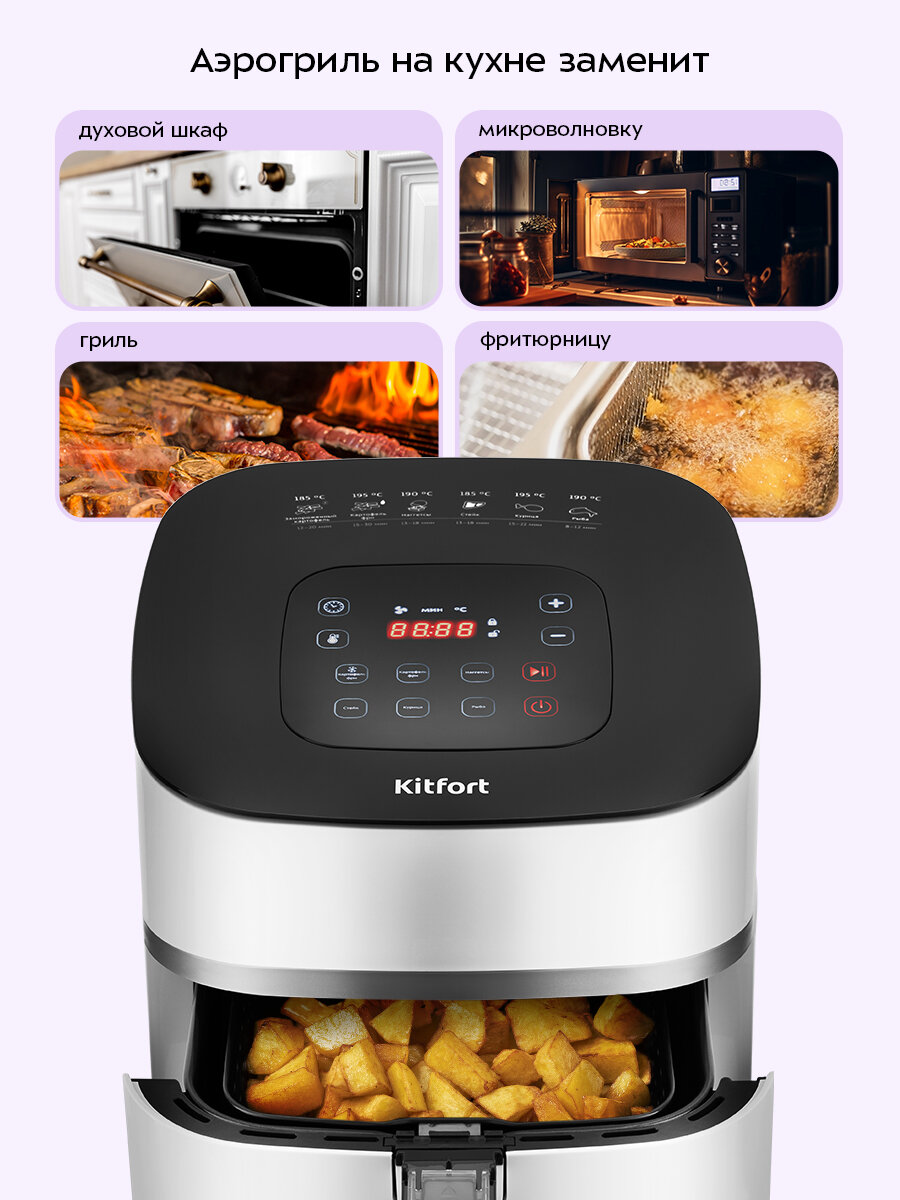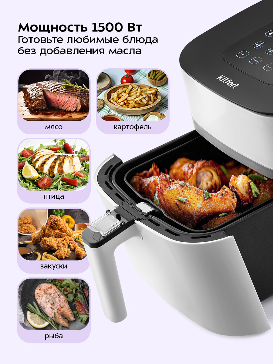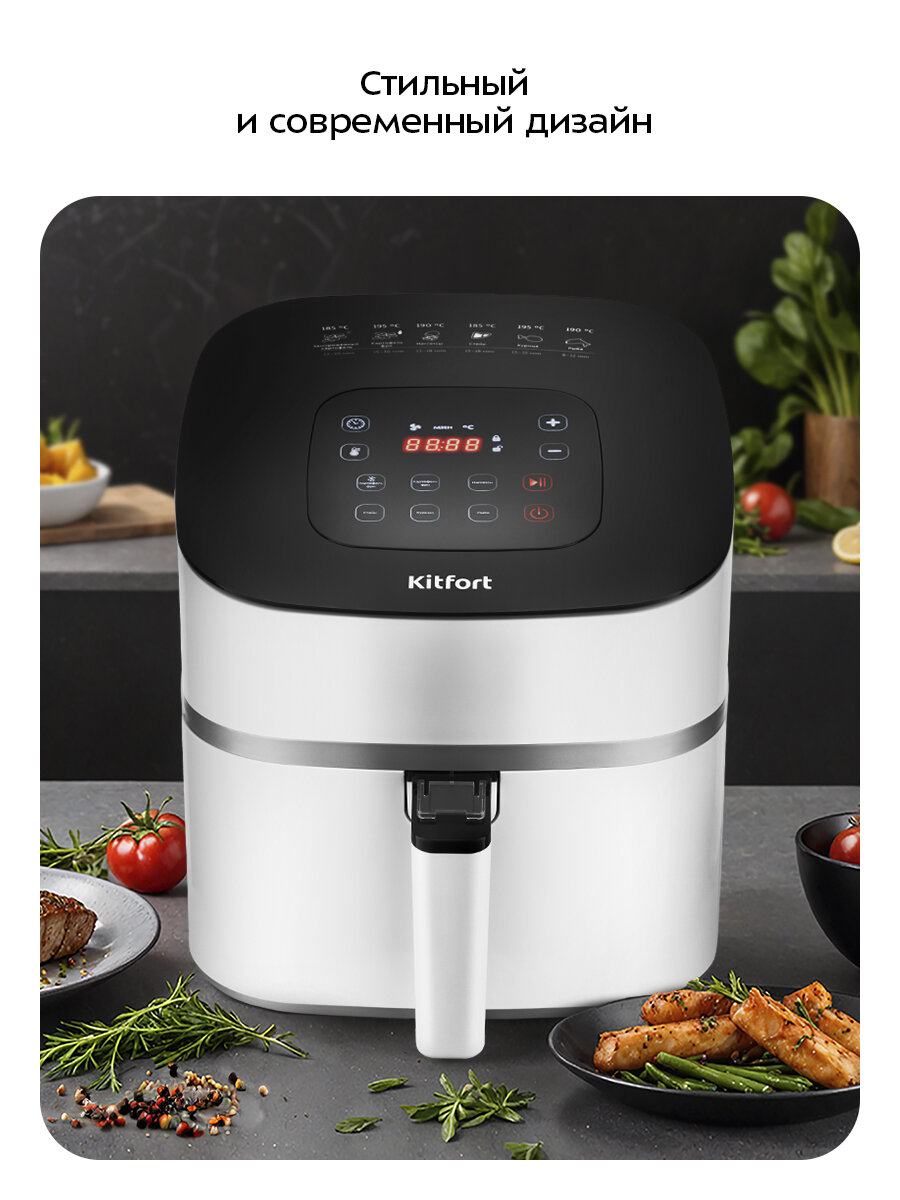 Современный аэрогриль Kitfort КТ-2217 — универсальное устройство, которое позволяет готовить разнообразные блюда. Он подходит для приготовления большинства блюд без масла: картофеля, мяса, птицы и рыбу, а также у него есть функция разморозки.