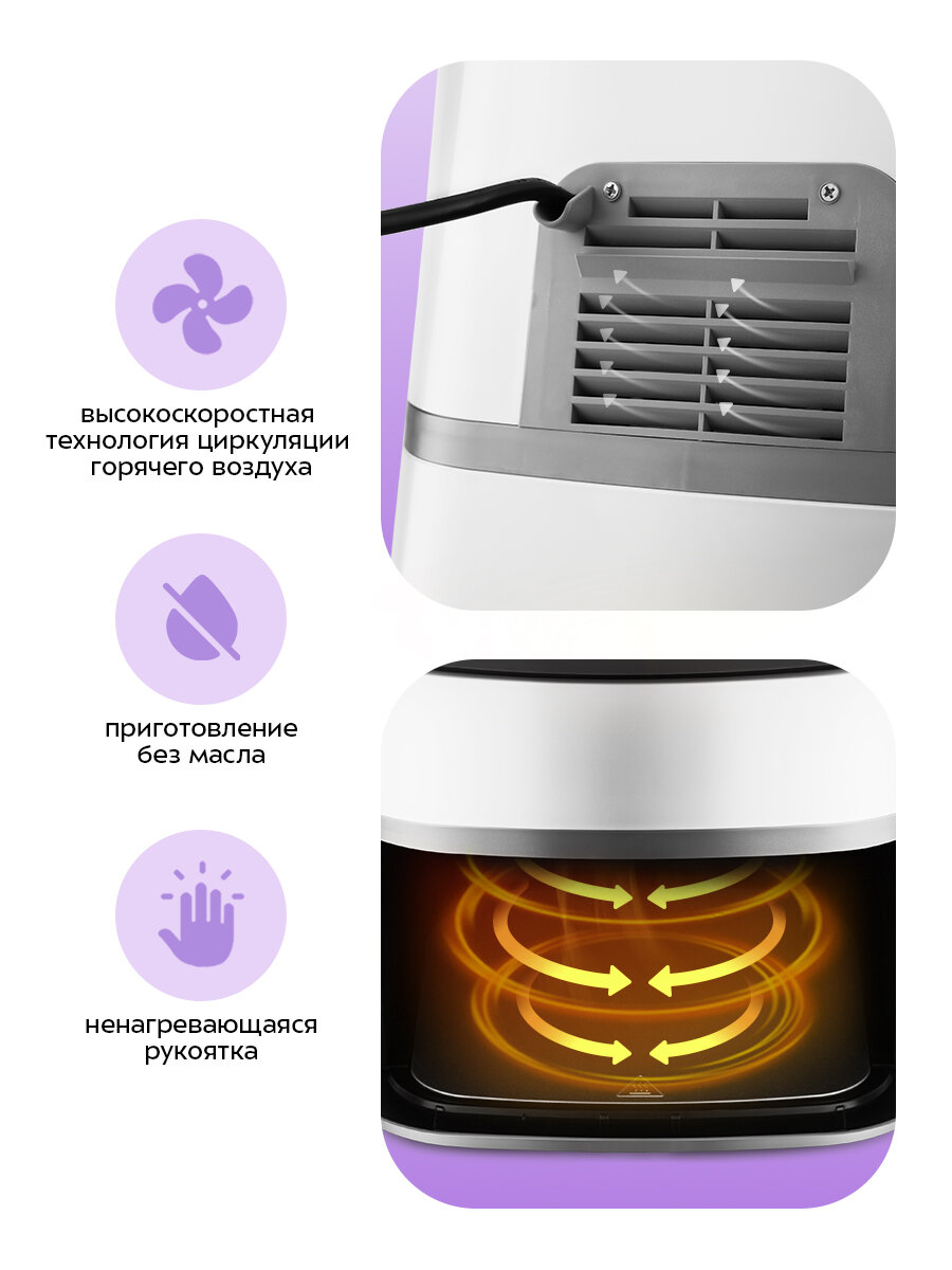 Благодаря системе циркуляции горячего воздуха, продукты обжариваются равномерно со всех сторон, получаясь при этом нежными внутри и с хрустящей корочкой снаружи.