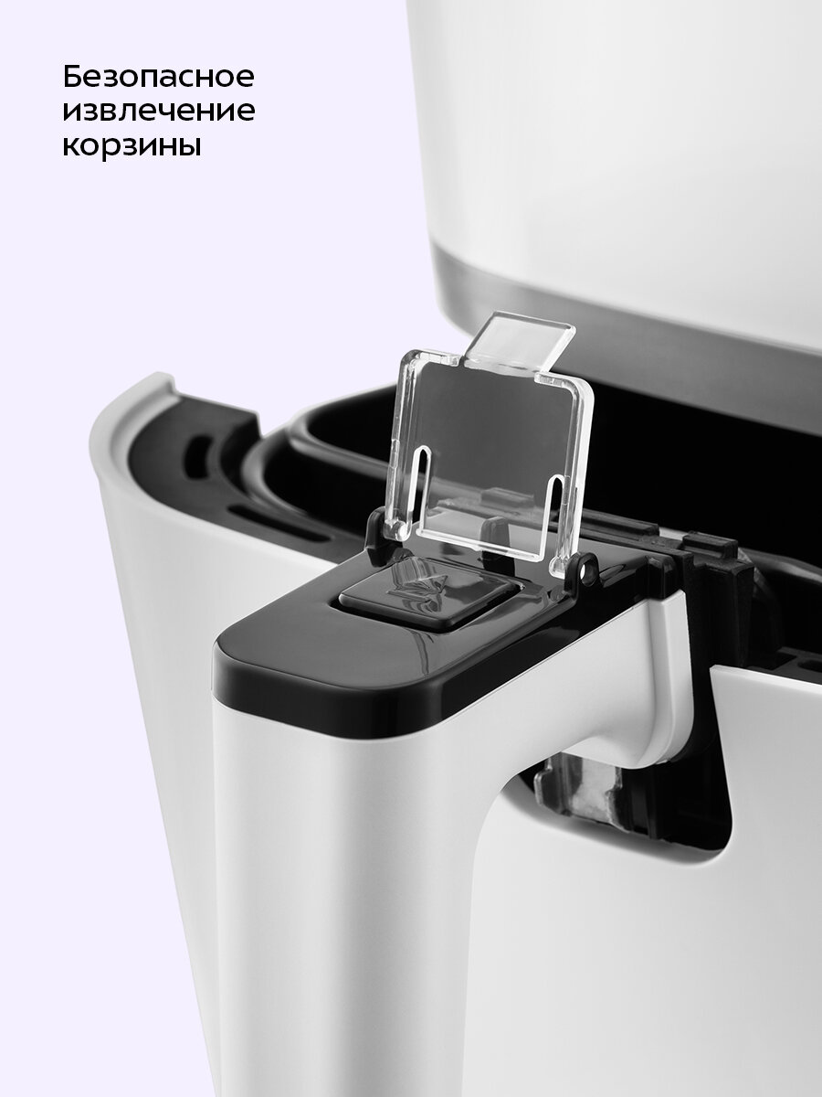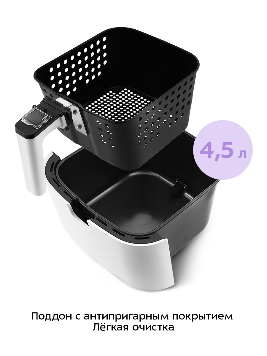 Съёмный поддон и корзина имеют антипригарное покрытие, благодаря чему они легко чистятся после использования, а блюда можно готовить практически без добавления масла.