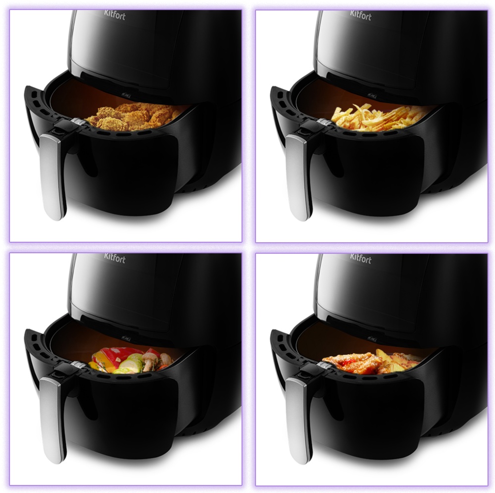 Аэрогриль Kitfort КТ-2220 может использоваться как аэрогриль, а также как аэрофритюрница и духовка и позволяет готовить большинство продуктов с минимальным количеством масла или вовсе без его добавления.