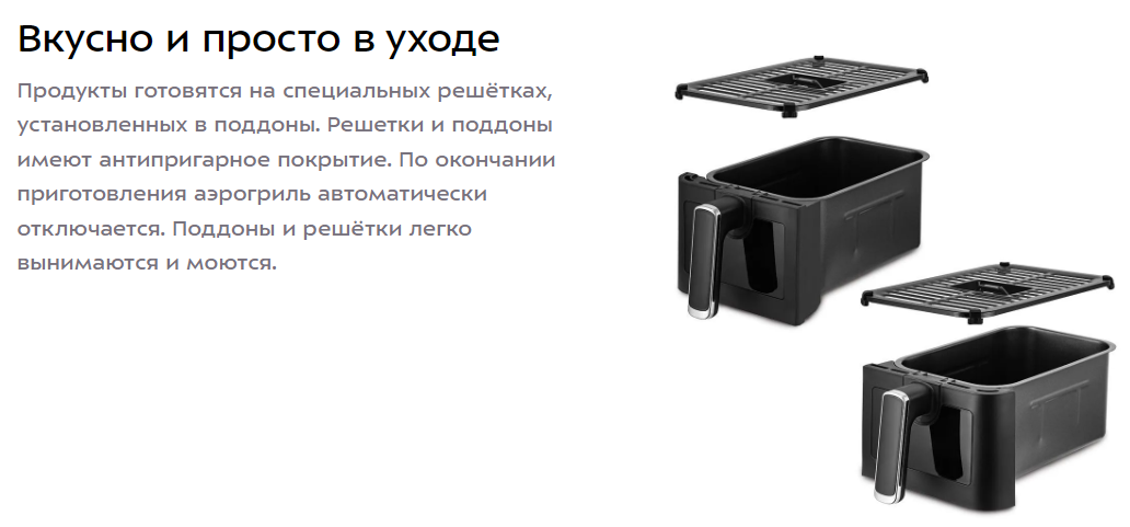 Продукты готовятся на специальных решётках, установленных в поддоны. Решетки и поддоны имеют антипригарное покрытие. По окончании приготовления аэрогриль автоматически отключается. Поддоны и решётки легко вынимаются и моются.