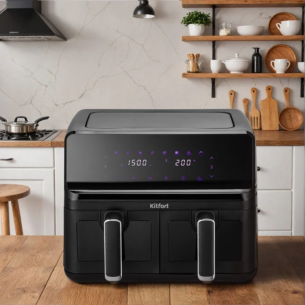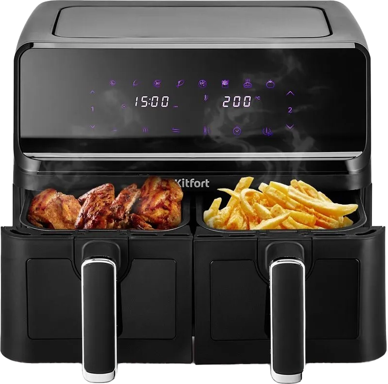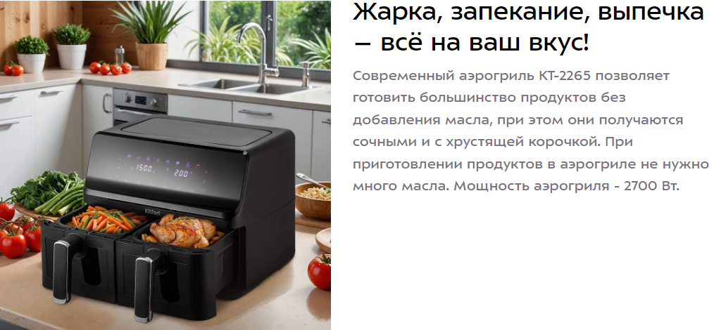 Современный аэрогриль КТ-2265 позволяет готовить большинство продуктов без добавления масла, при этом они получаются сочными и с хрустящей корочкой. При приготовлении продуктов в аэрогриле не нужно много масла. Мощность аэрогриля - 2700 Вт.