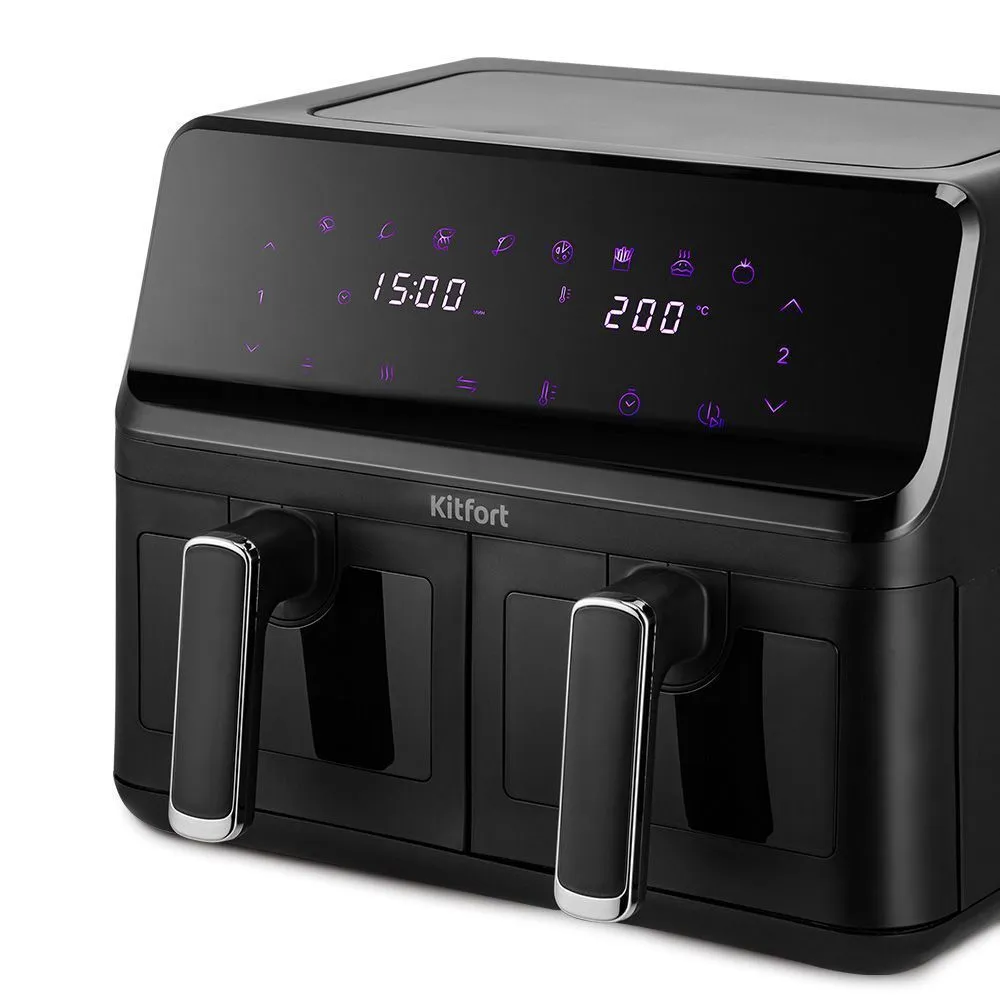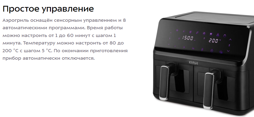 Аэрогриль оснащён сенсорным управлением и 8 автоматическими программами. Время работы можно настроить от 1 до 60 минут с шагом 1 минута. Температуру можно настроить от 80 до 200 °С с шагом 5 °С. По окончании приготовления прибор автоматически отключается.