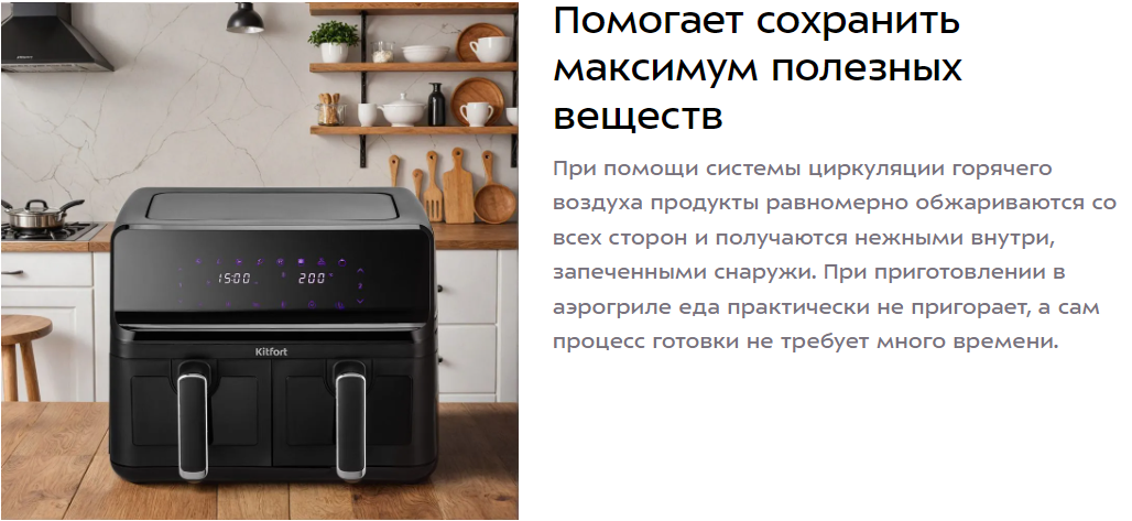 При помощи системы циркуляции горячего воздуха продукты равномерно обжариваются со всех сторон и получаются нежными внутри, запеченными снаружи. При приготовлении в аэрогриле еда практически не пригорает, а сам процесс готовки не требует много времени.