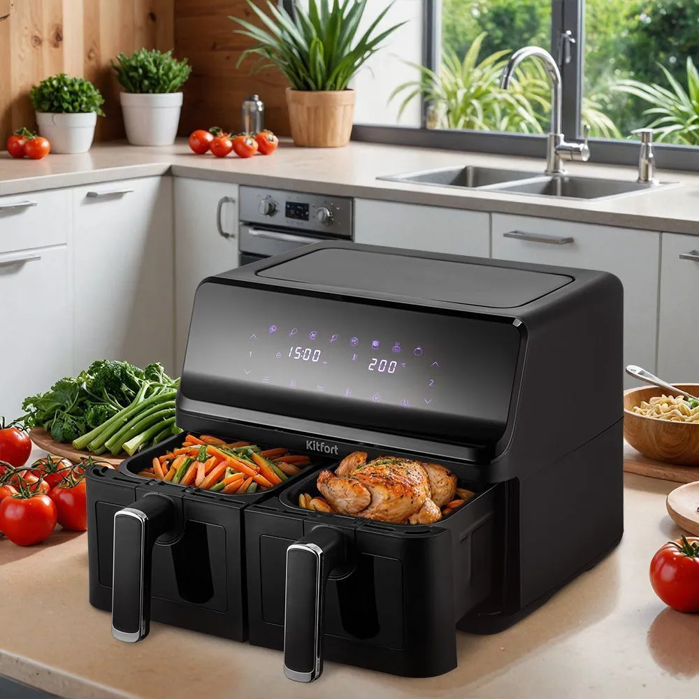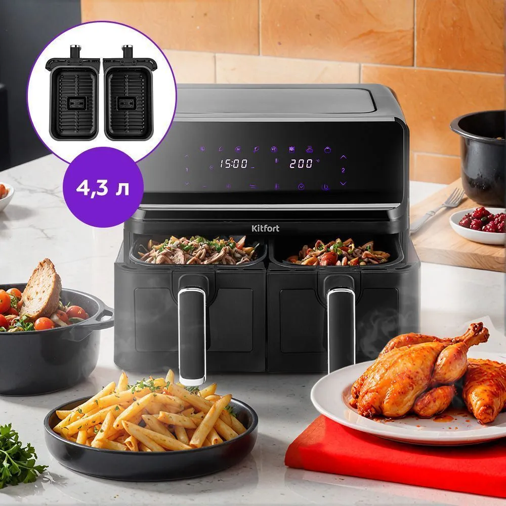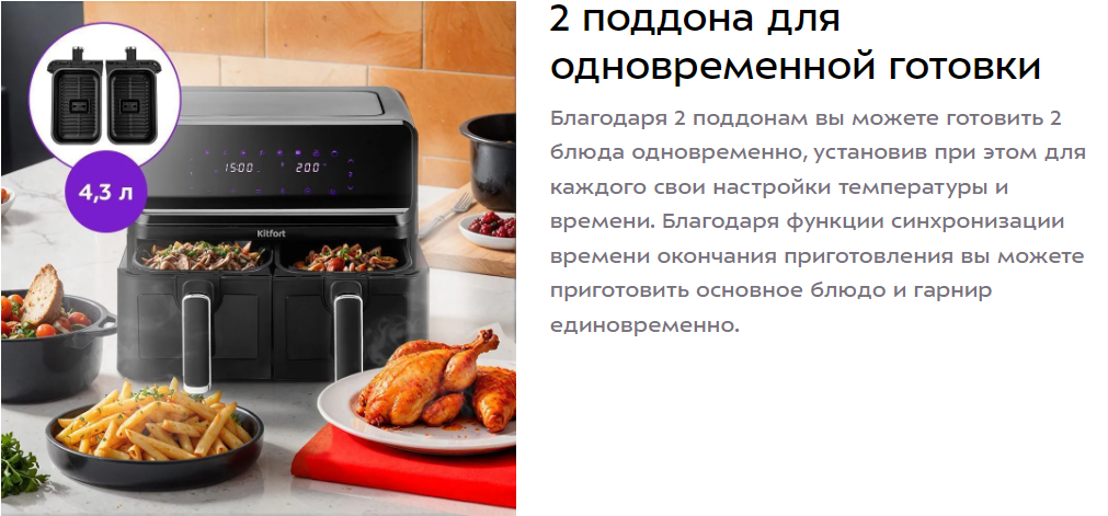 Благодаря 2 поддонам вы можете готовить 2 блюда одновременно, установив при этом для каждого свои настройки температуры и времени. Благодаря функции синхронизации времени окончания приготовления вы можете приготовить основное блюдо и гарнир единовременно.