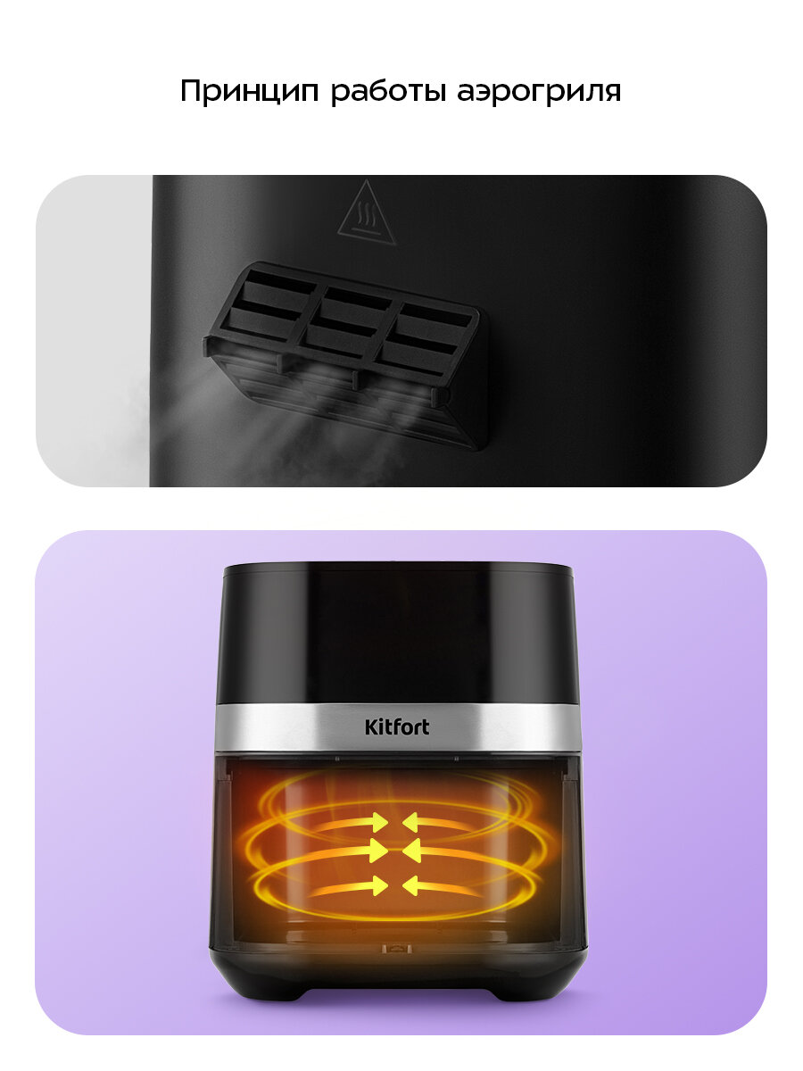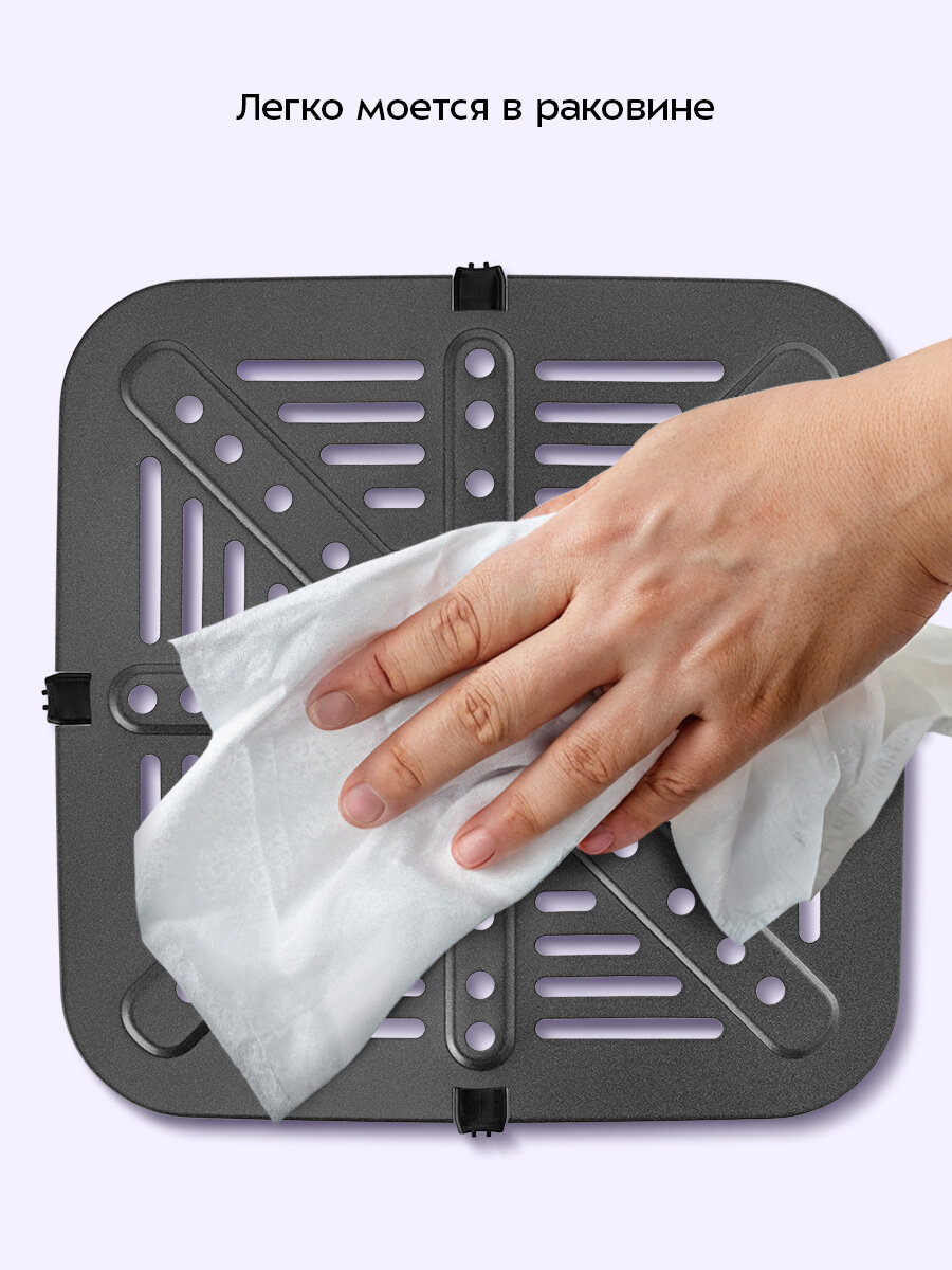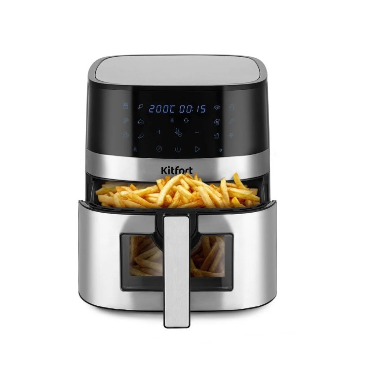 Аэрогриль сочетает в себе стильный дизайн и продуманный функционал. Его мощности 1500 Вт достаточно, чтобы приготовление не заняло много времени. А благодаря антипригарной панели к корзине на 6,5 л ничего не пригорит!