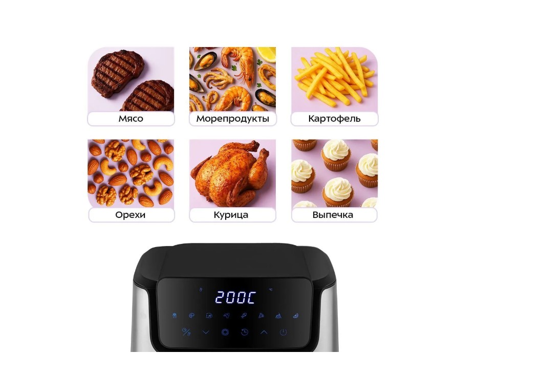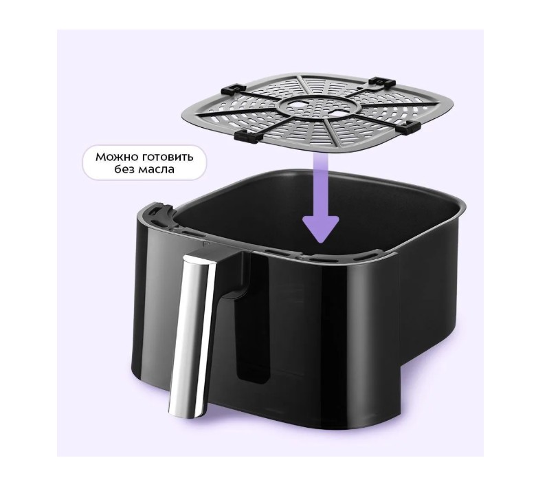 Внутри поддона (ёмкость 6,5 л) установлена решётка с антипригарным покрытием. Это позволяет готовить без масла и предотвращает прилипание продуктов. Решётка и поддон легко снимаются и моются, что делает устройство удобным в использовании.