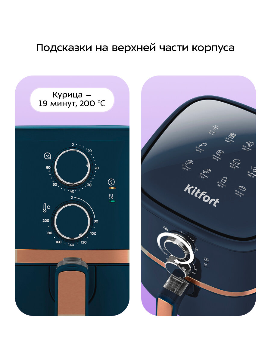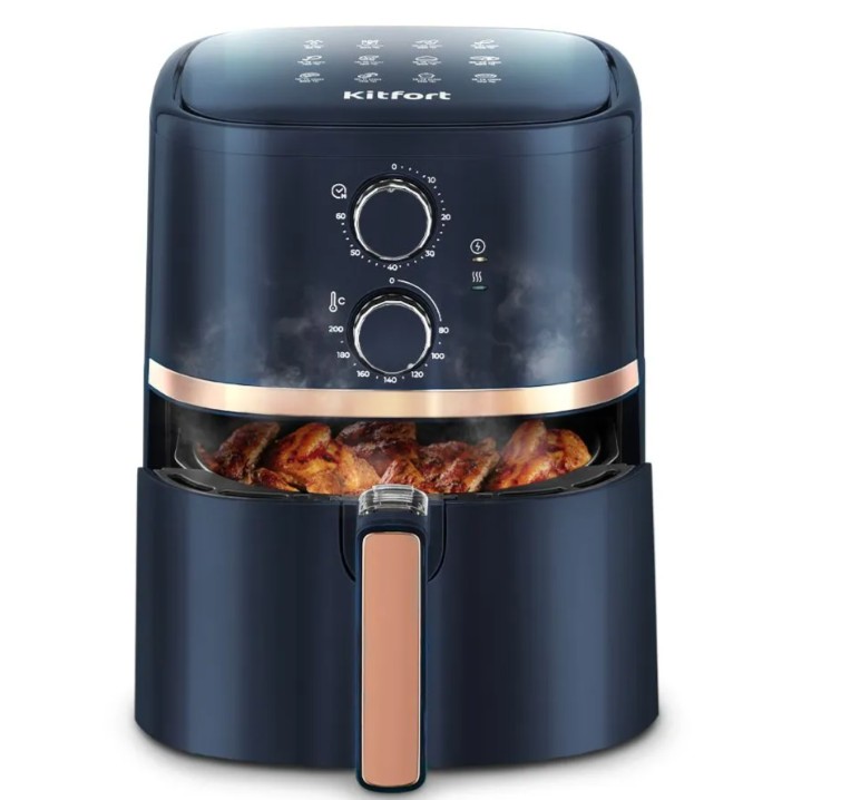 Современный аэрогриль КТ-8106 помогает в ежедневной готовке, беря на себя процесс выпечки, запекания или разморозки. А главный плюс – вам практически не понадобится масло, ведь аэрогриль использует систему обдува горячим воздухом.