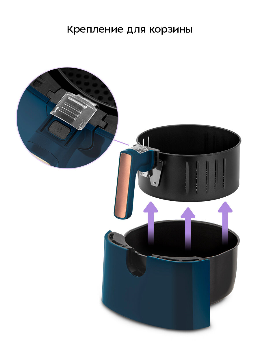 Корзина поддона КТ-8106 дополнительно оборудована специальным креплением, которое позволяет с лёгкостью отсоединить её от основного поддона. Это не только облегчит процесс перекладывания еды в посуду, но и процесс очистки элементов аэрогриля.