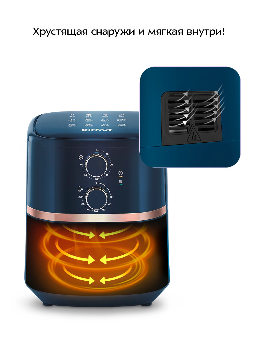 Благодаря системе циркуляции горячего воздуха, продукты обжариваются равномерно со всех сторон, получаясь при этом нежными внутри и с хрустящей корочкой снаружи.
