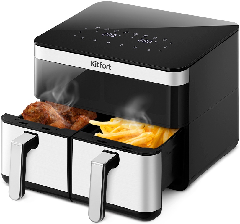 Главное преимущество аэрогриля — наличие 2 нагревателей и 2 поддонов. Это позволяет одновременно готовить 2 блюда, устанавливая для каждого свои настройки. Функция синхронизации времени окончания приготовления позволяет приготовить всё к одному времени.