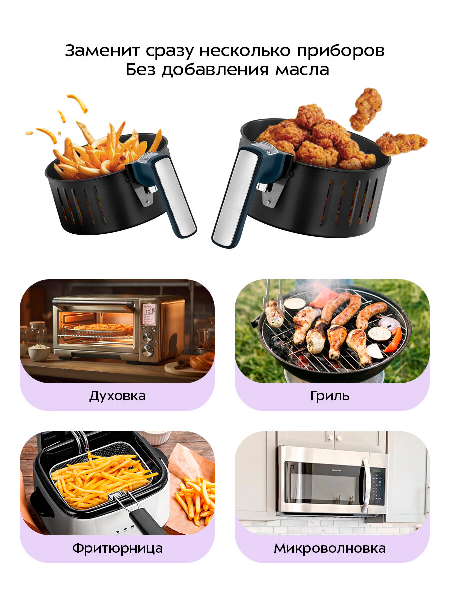 Аэрогриль КТ-8118 заменит сразу несколько приборов одним собой, так как имеет все функции, включающие в себя: запекание, как в духовке, гриль, фритюр и подогрев, как в микроволновке. При этом он не займёт много места на кухне!