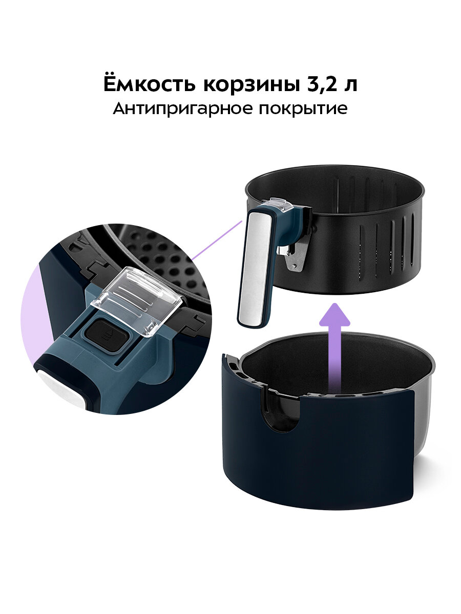 Корзина и поддон имеют антипригарное покрытие. Поддон и корзина легко вынимаются и моются, а на ручке корзины расположена кнопка-блокиратор, предотвращающая случайное отсоединение корзины от поддона.