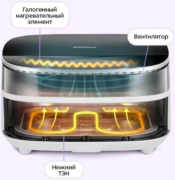 Галогеновый нагреватель готовит горячим воздухом и ИК-излучением, делая румяные корочки. Нижний ТЭН подогревает поддон снизу, что позволяет блюду пропечься со всех сторон. Вентилятор равномерно распределяет тепло, исключая непропечённые участки.