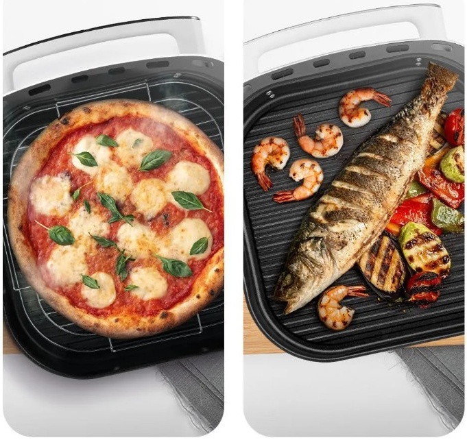 Внутри поддона можно установить решётку из нержавеющей стали. Это удобно для приготовления пиццы и выпечки, её можно мыть в посудомоечной машине. Благодаря широкому поддону можно готовить вдвое больше блюд. Также доступна функция подогрева еды.
