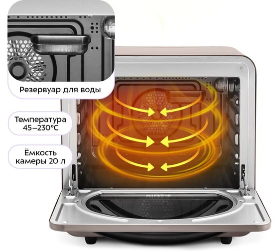 Принцип работы аэрогриля основан на конвекции: вентилятор прогоняет воздух, нагретый ТЭНом, внутри рабочей камеры, нагревая продукты до заданной температуры. Сзади есть резервуар для воды, обеспечивающий идеальную влажность в камере.