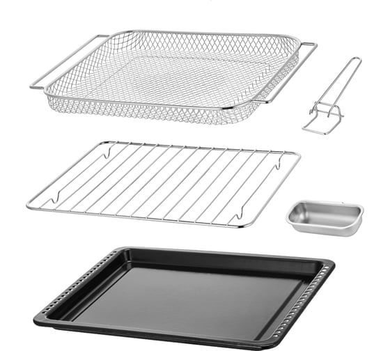 В комплект входят противень, решётка и сетчатая корзина и ручка для их безопасного извлечения из аэрогриля. Также есть резервуар для воды, который устанавливается на заднюю стенку камеры аэрогриля. Их легко снять и просто очистить.