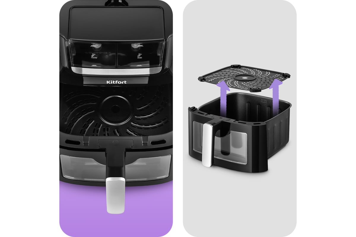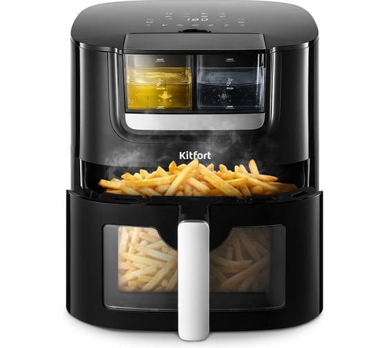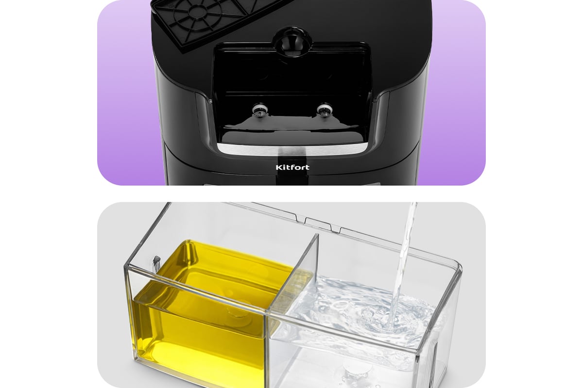 Прибор оснащён двойным резервуаром для воды и масла. Из резервуара для воды с помощью помпы в поддон распыляется пар. Так продукты становятся более нежными и сочными. Распыление масла в свою очередь помогает создать хрустящую корочку!