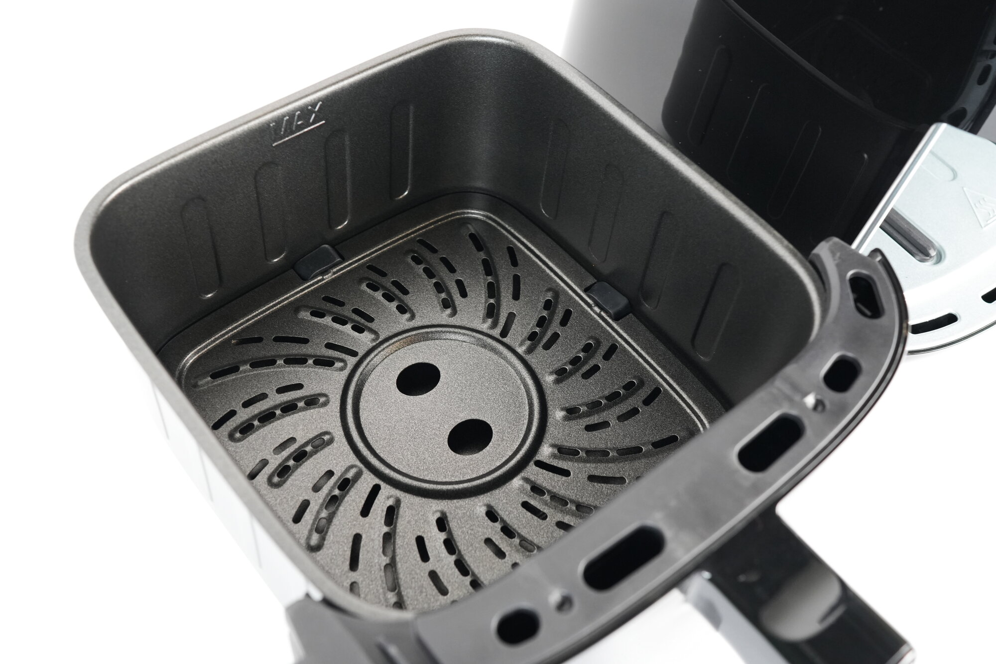 Корпус аэрогриля изготовлен из полипропилена, что обеспечивает его долговечность и надежность. Нагревательный элемент из нержавеющей стали S/S 304 гарантирует равномерное и быстрое нагревание. Нескользящие ножки обеспечивают устойчивость устройства на любой поверхности.