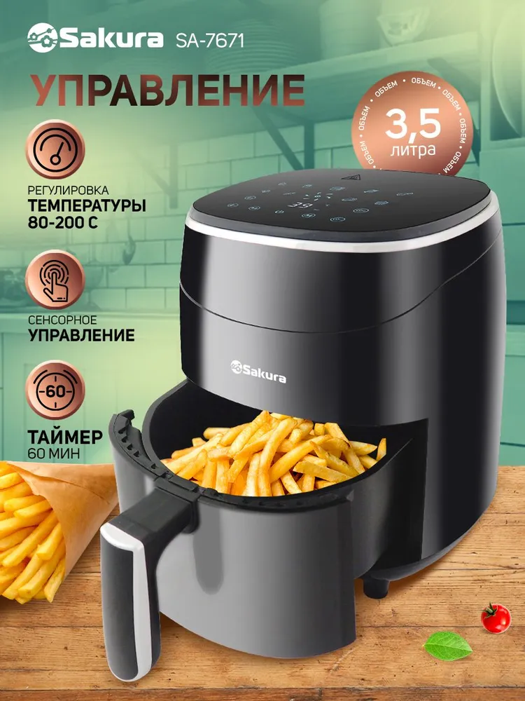 Аэрогриль, 1200 Вт, чаша с антипригарным покрытием 3,5 л, таймер на 60 минут, регулировка температуры 80-200С, сенсорное управление, LED дисплей, готовит без масла или с минимальным его использованием.