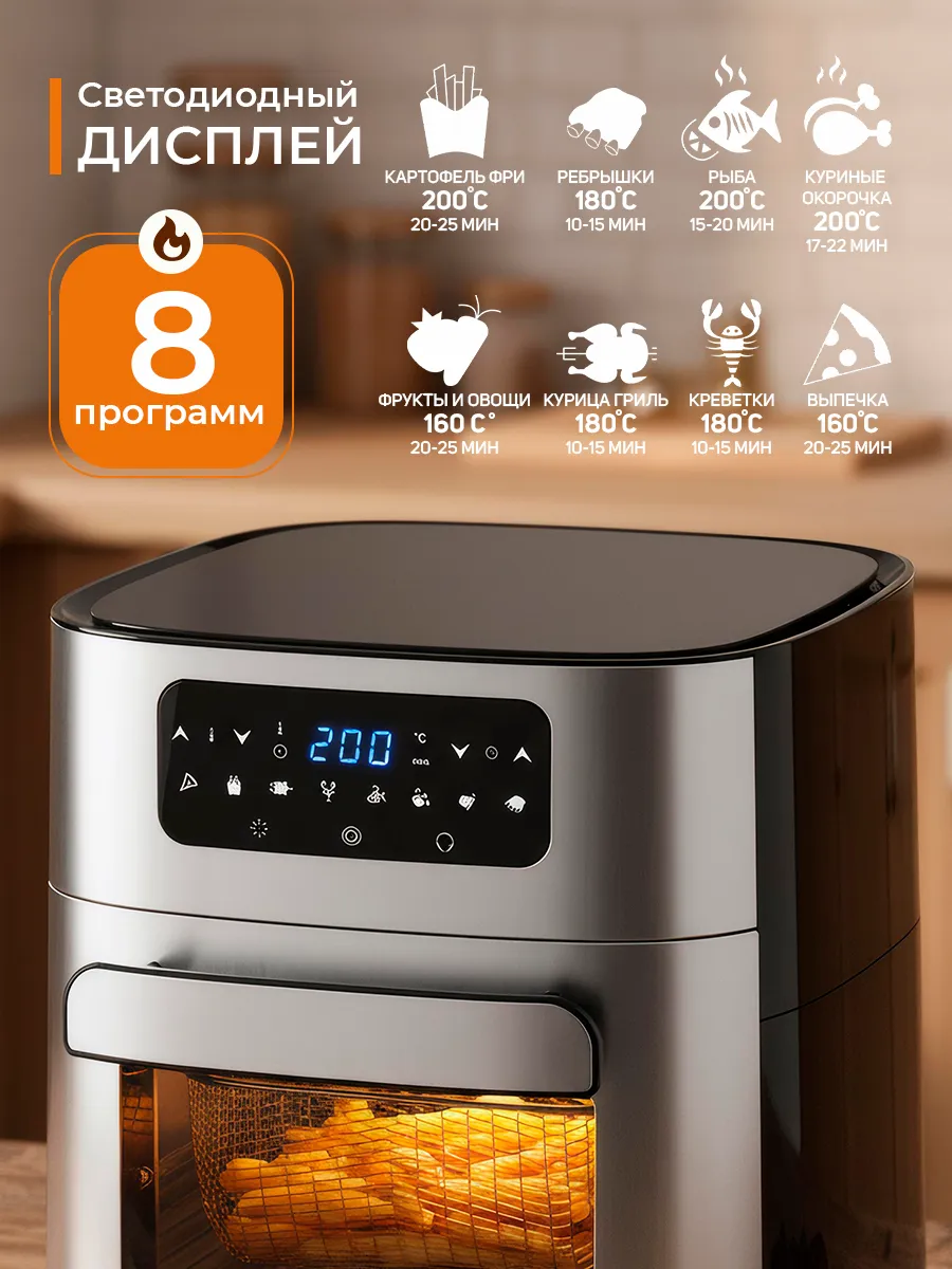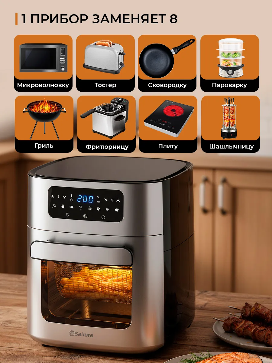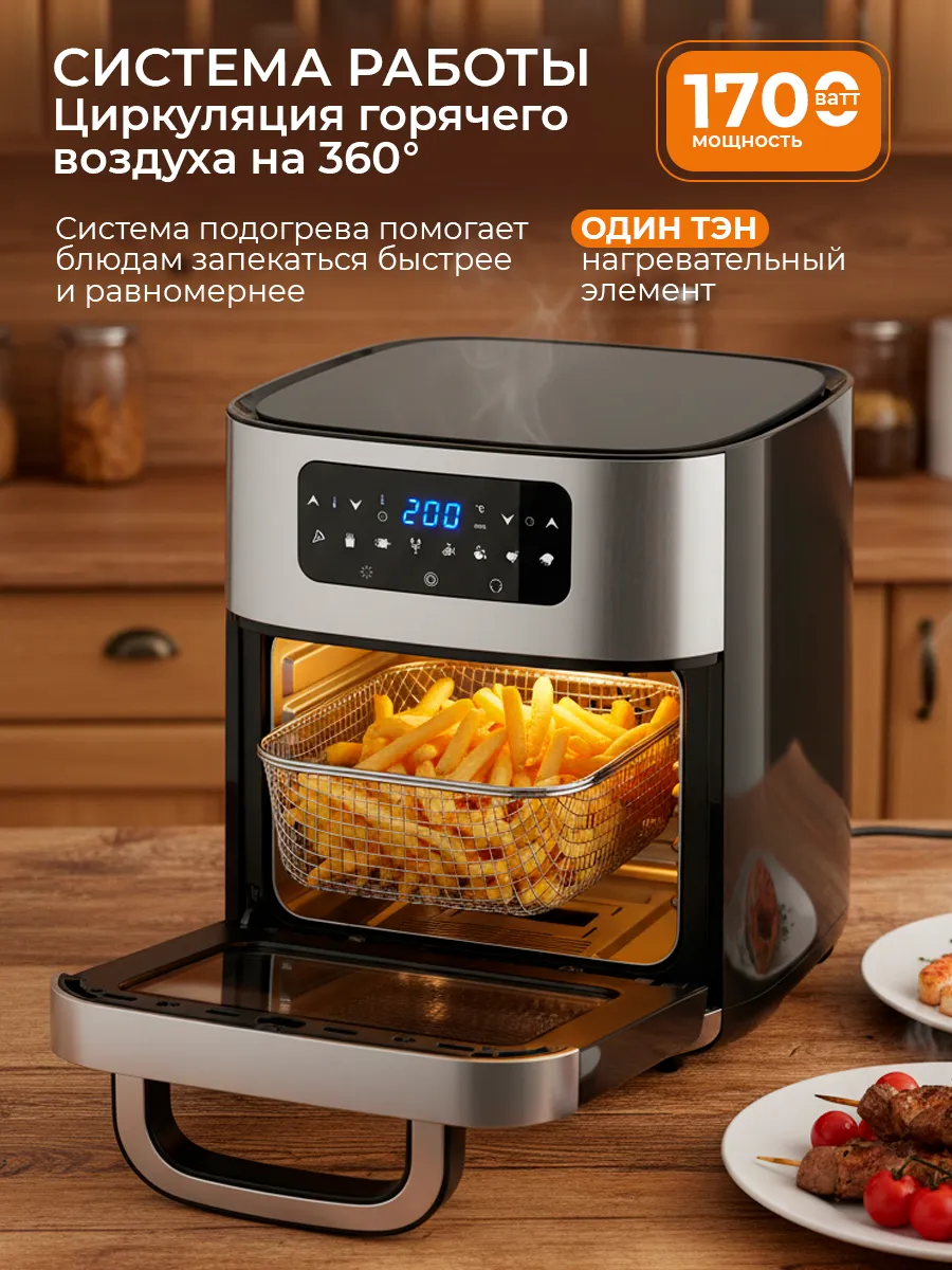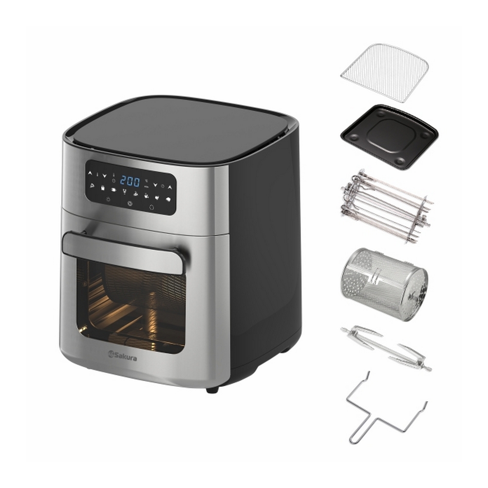 Комплектация: 6 аксессуаров в комплекте (поддон для сбора масла, решетка, сетчатая корзина, ручка для извлечения корзины, вертел, шашлычница на 10 шампуров)