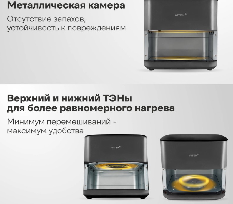 Верхний и нижней ТЭНы для оптимальной прожарки со всех сторон и минимизации перемешивания. Широкий выбор температуры от 35С° вы можете сушить продукты. Внутреняя камера сделана из металла, что обеспечивает стабильную температуру и более долговечный срок службы.