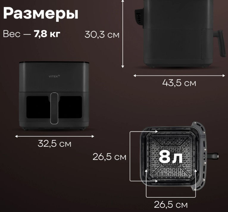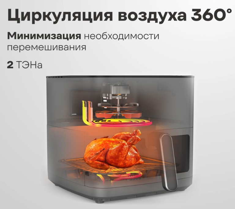 Аэрогриль позволяет готовить с минимальным количеством масла или совсем без него. Блюда будут более полезными, с хрустящей корочкой снаружи и нежная внутри. Окошко и подсветка для визуального контроля без открытия камеры.