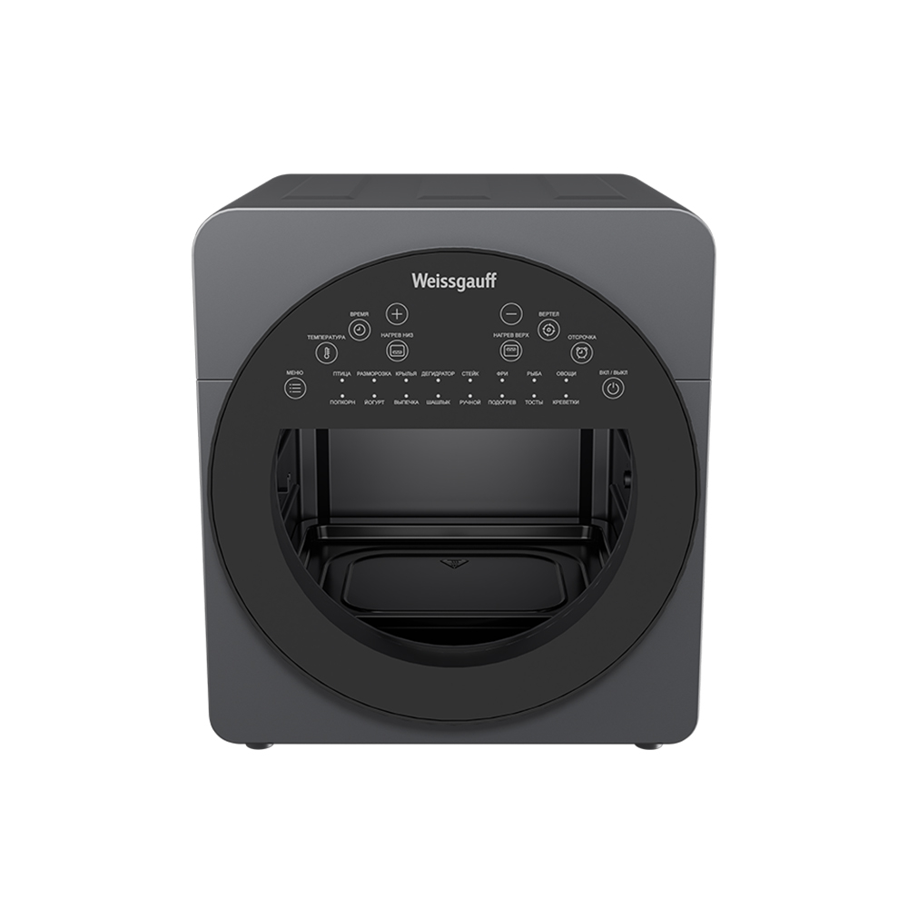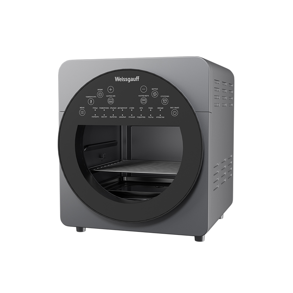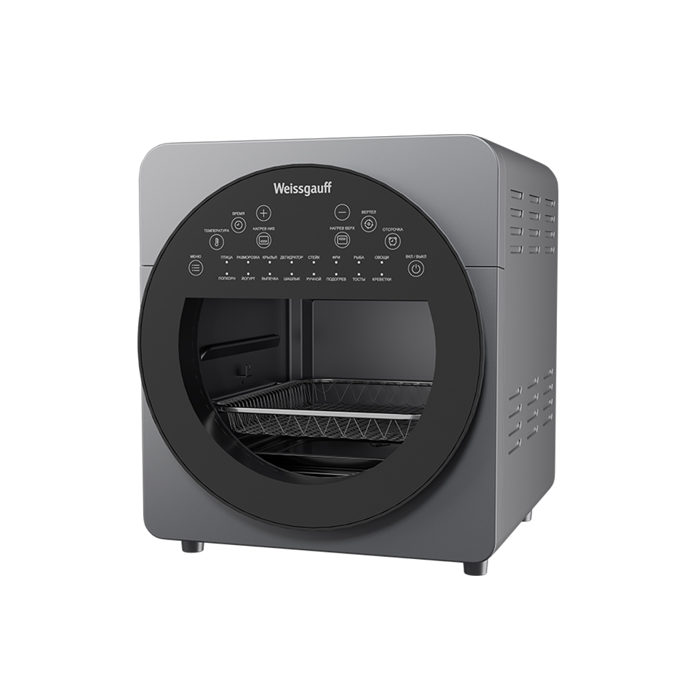 Программы: Птица, Разморозка, Крылья, Дегидратор, Стейк, Фри, Рыба, Овощи, Попкорн, Йогурт, Выпечка, Шашлык, Ручной, Подогрев, Тосты, Креветки
