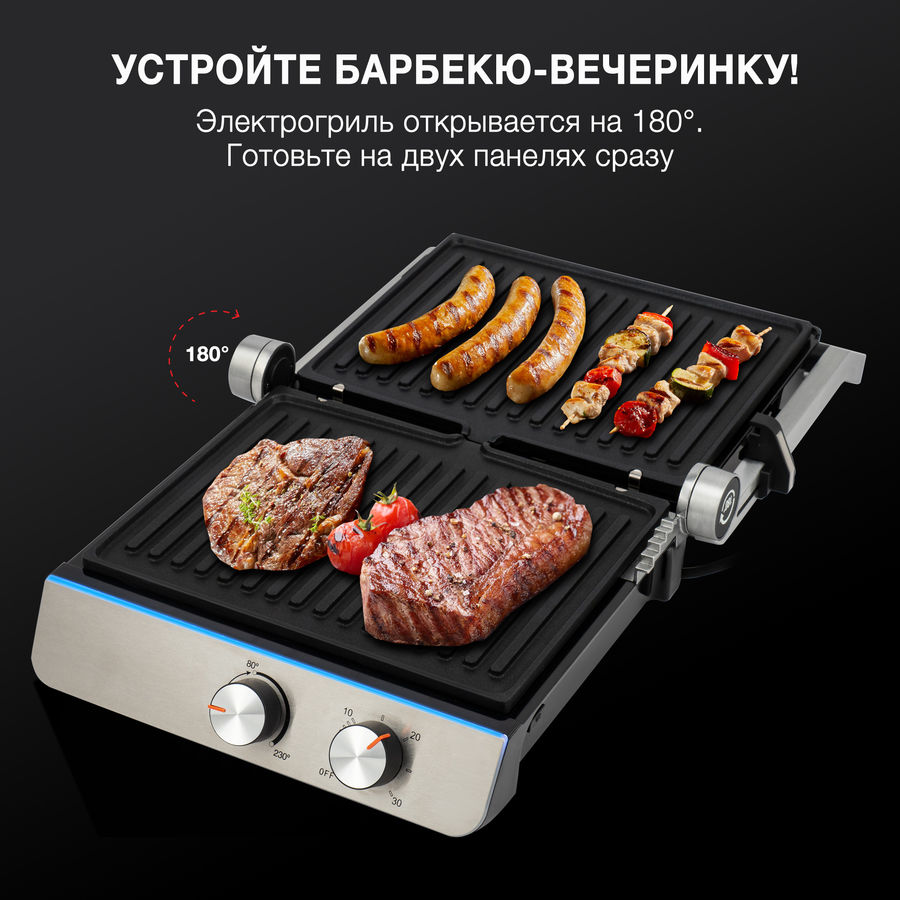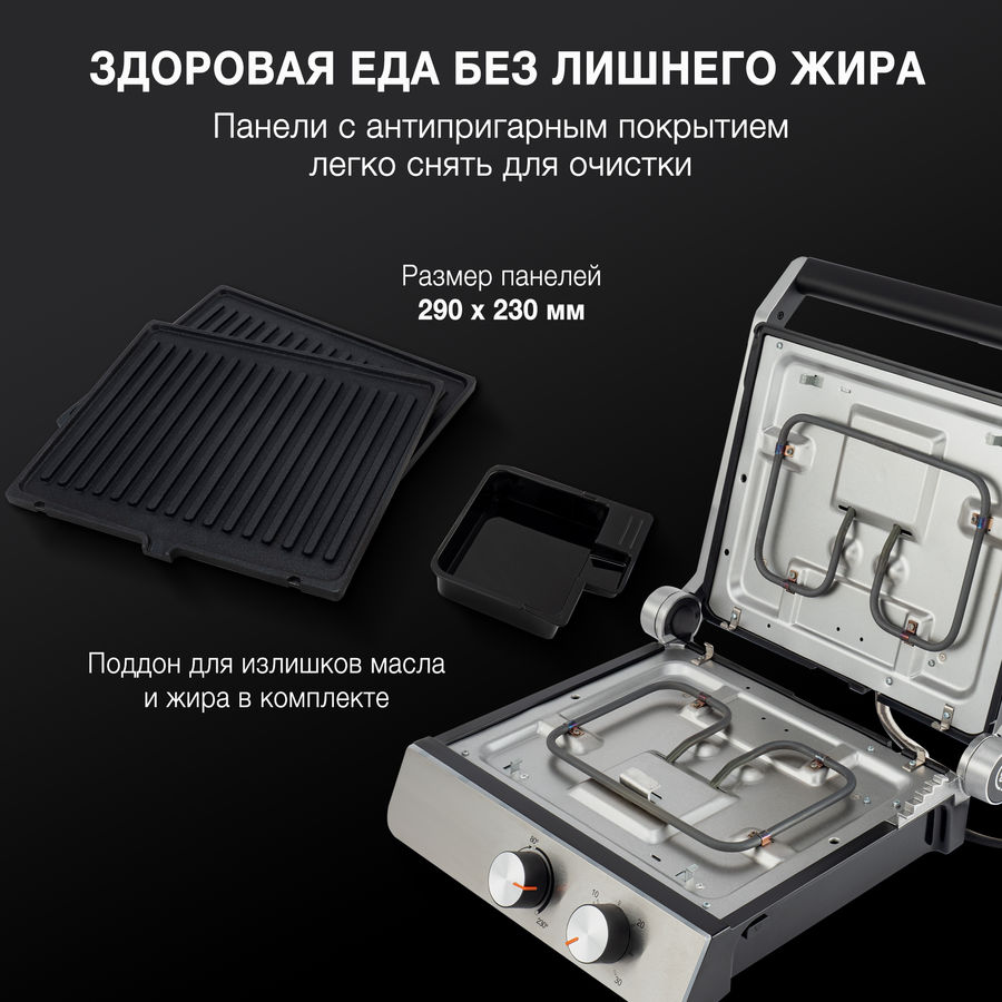 Верхняя крышка имеет «плавающий» фиксатор и адаптирует свое положение под любой продукт с максимальным касанием к панели нагрева.