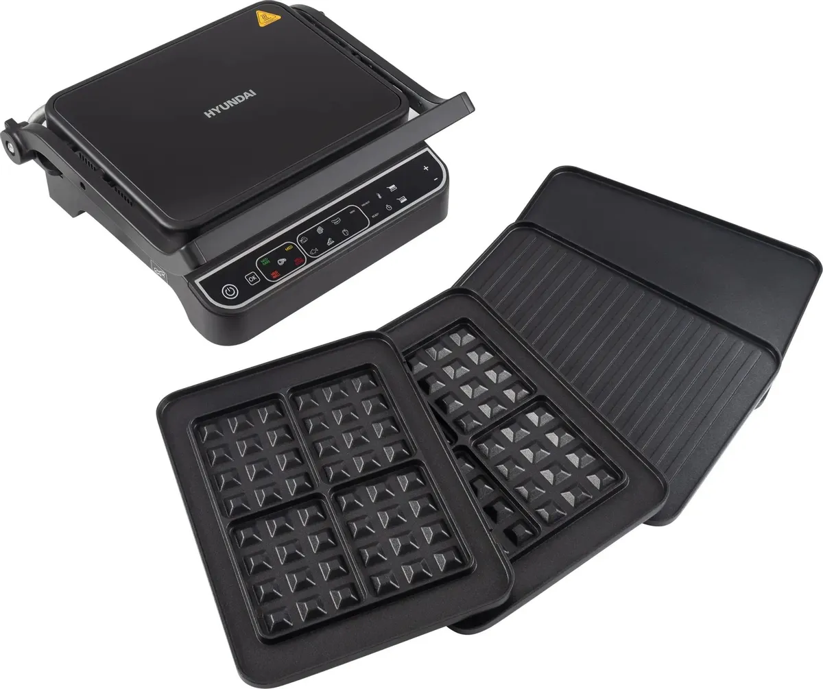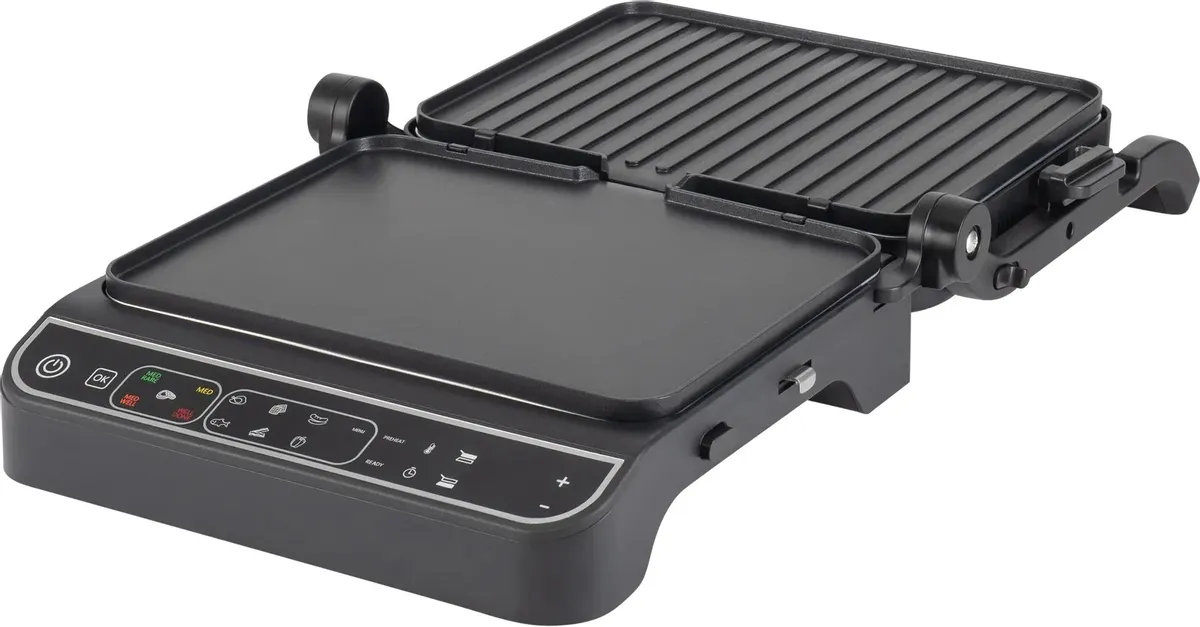 Термощуп обеспечивает автоматический контроль температуры внутри стейка, тем самым контролирует степень прожарки. Панели для приготовления вафель в комплекте. 10 автоматических программ для приготовления, а так же ручной режим, для оптимальных настроек для каждого типа продуктов. Открытие на 180°, плоская панель и раздельная регулировка температуры панелей, позволяет использовать гриль как плиту.