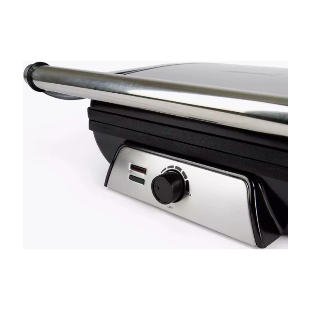 Управление грилем осуществляется механически, а корпус выполнен из комбинированного материала. Рабочая поверхность гриля изготовлена из металла, что гарантирует долговечность и надежность устройства.
