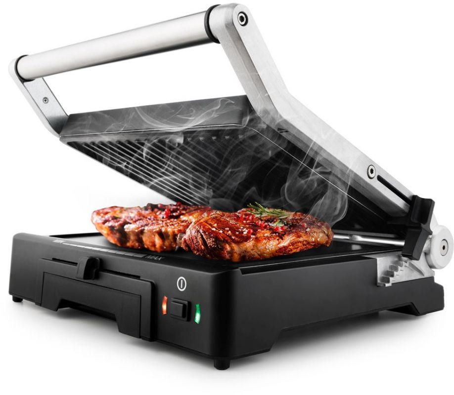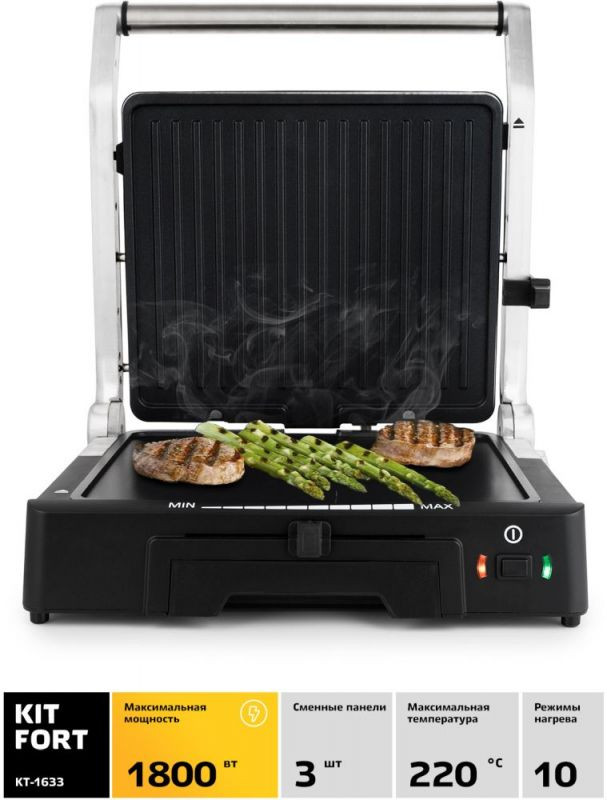 Описание: Контактный электрический гриль. Позволяет приготовлять стейки, овощи, рыбу, бутерброды, гренки и многое другое. Ребристая поверхность рабочих пластин и высокая температура приготовления способствуют удалению излишков жира из продуктов. Конструкция «3 в 1» позволяет использовать гриль в трех режимах.