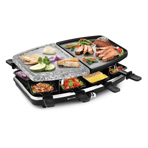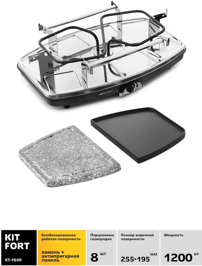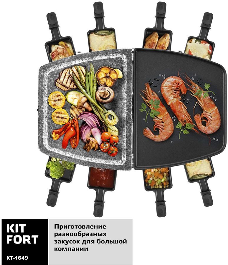 Описание: Раклетница-гриль Kitfort KT-1649 — это устройство для приготовления разнообразных закусок, а также она может объединить вокруг себя теплую компанию друзей. Приглашайте гостей и родственников и устраивайте раклет-вечеринку. Пока на сковородках плавится сыр, ваши гости сами приготовят себе начинку по своему вкусу: обжарят камне кусочки картофеля или перца, приготовят стейк или колбаски, а на панели с антипригарным покрытием пожарят блинчики. Вам нужно только подготовить ингредиенты и поставить их к раклетнице на стол. Вы можете плавно менять температуру при помощи регулятора на корпусе прибора. Около регулятора расположен индикатор нагрева. Устройство оснащено ТЭНом. Сверху ТЭН закрывает каменная плита и панель с антипригарным покрытием.