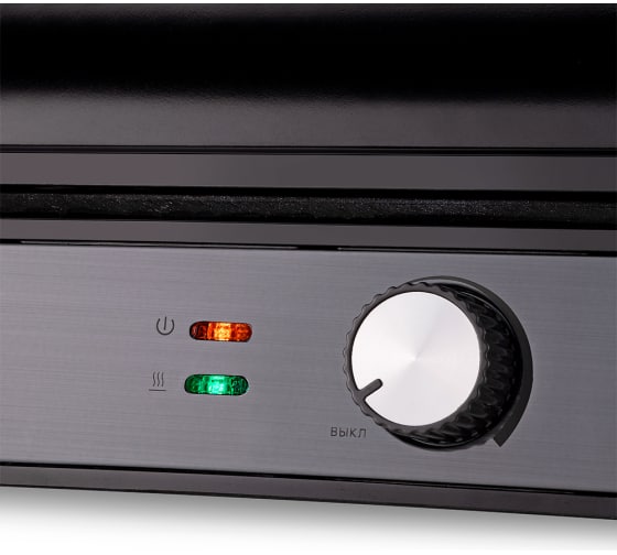 Гриль оснащен термостатом для поддержания температуры панелей, а также индикаторами работы и нагрева. С помощью регулятора температуры вы сможете плавно менять температуру приготовления.