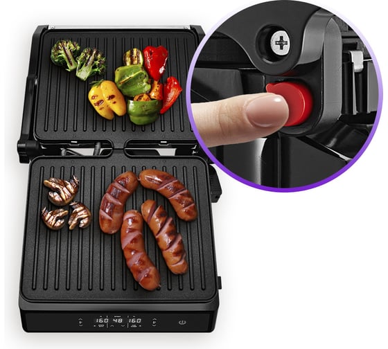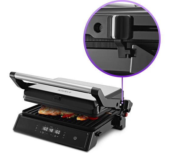 Специальный фиксатор сбоку гриля удерживает крышку в закрытом состоянии, что делает готовку, транспортировку и хранение более удобными.