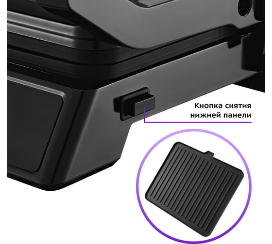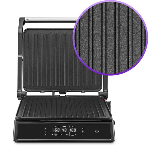 На панели нанесено антипригарное покрытие, что позволяет готовить с минимальным количеством масла или без него. Такое покрытие также облегчает процесс чистки панелей. Панели у этого гриля съемные.